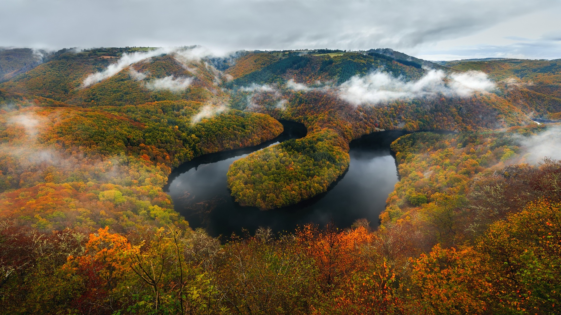 Description: A river surrounded by trees in the middle of a forest with clouds in the sky above it and a mountain in the background.
