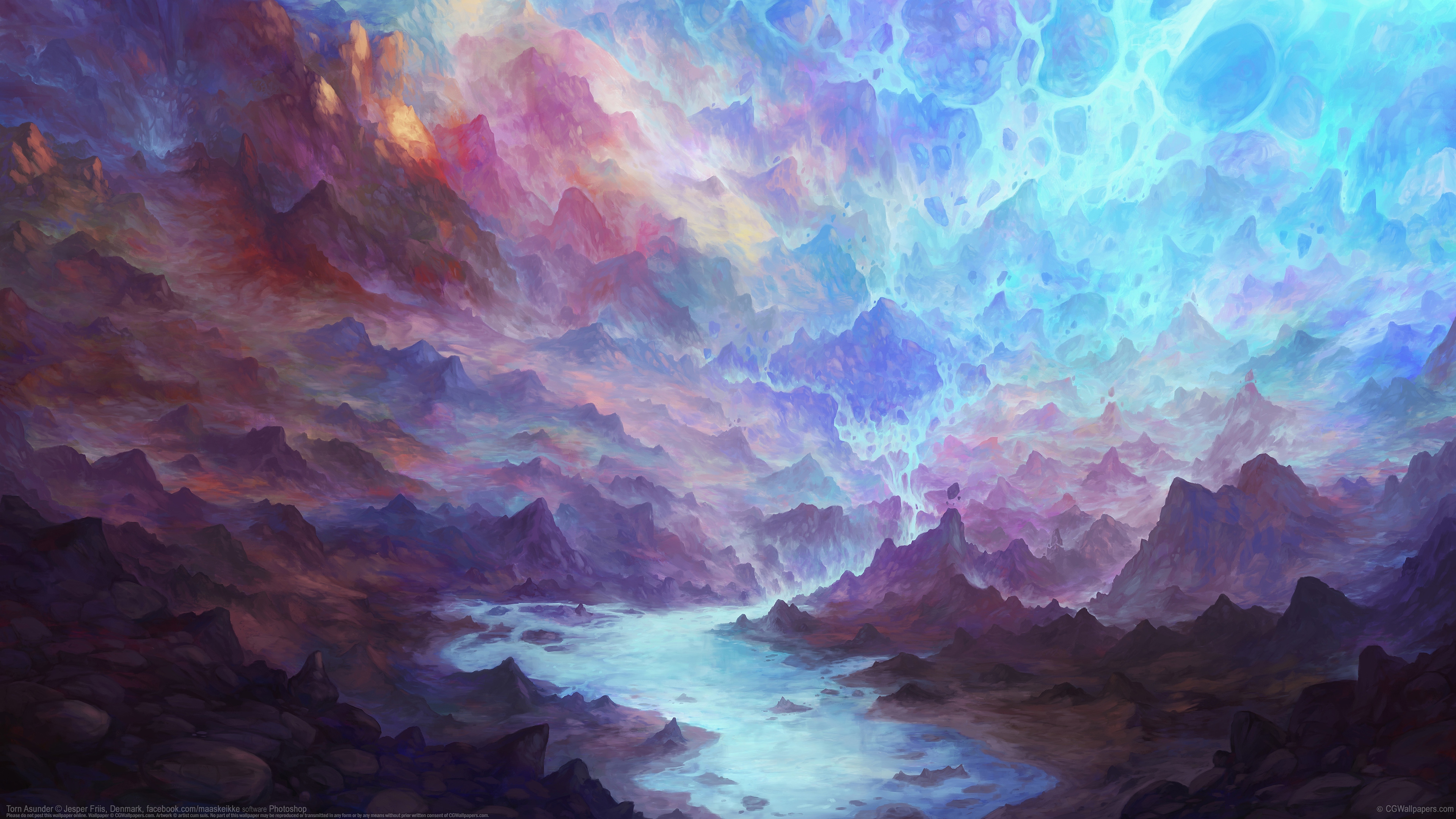 Description: A painting of a river flowing through a valley under a cloudy sky with a colorful sky above it and a river below.