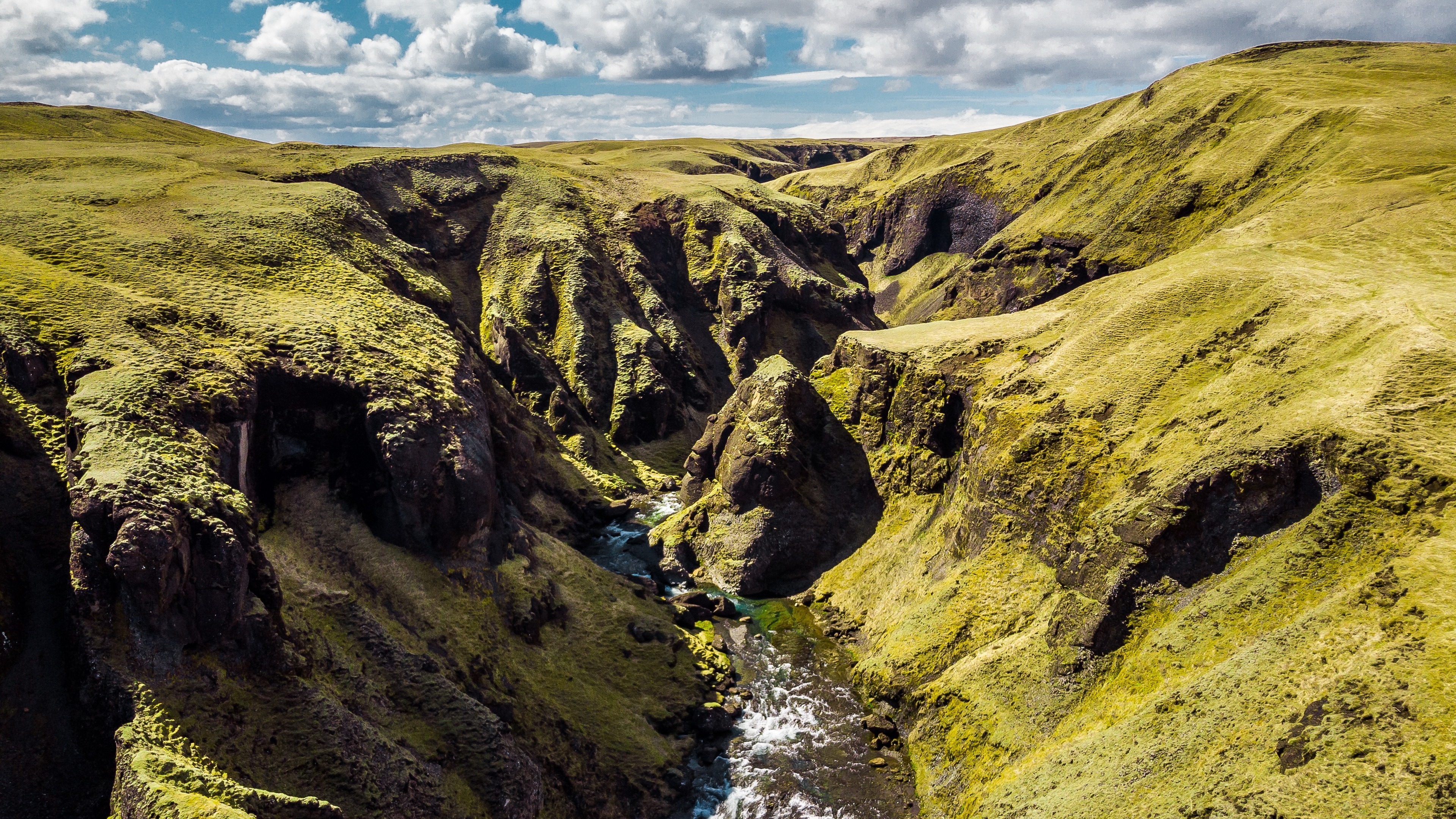 Description: A river flowing through a lush green valley under a cloudy sky with a few clouds above it and a river running between the mountains.