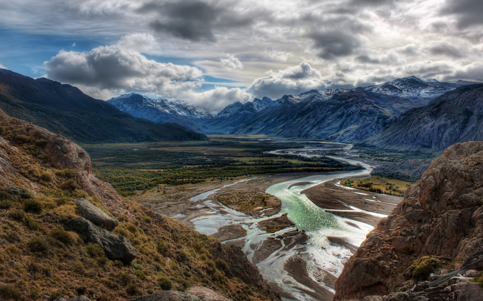 Description: A river flowing through a valley surrounded by mountains under a cloudy sky with a few clouds in the sky.
