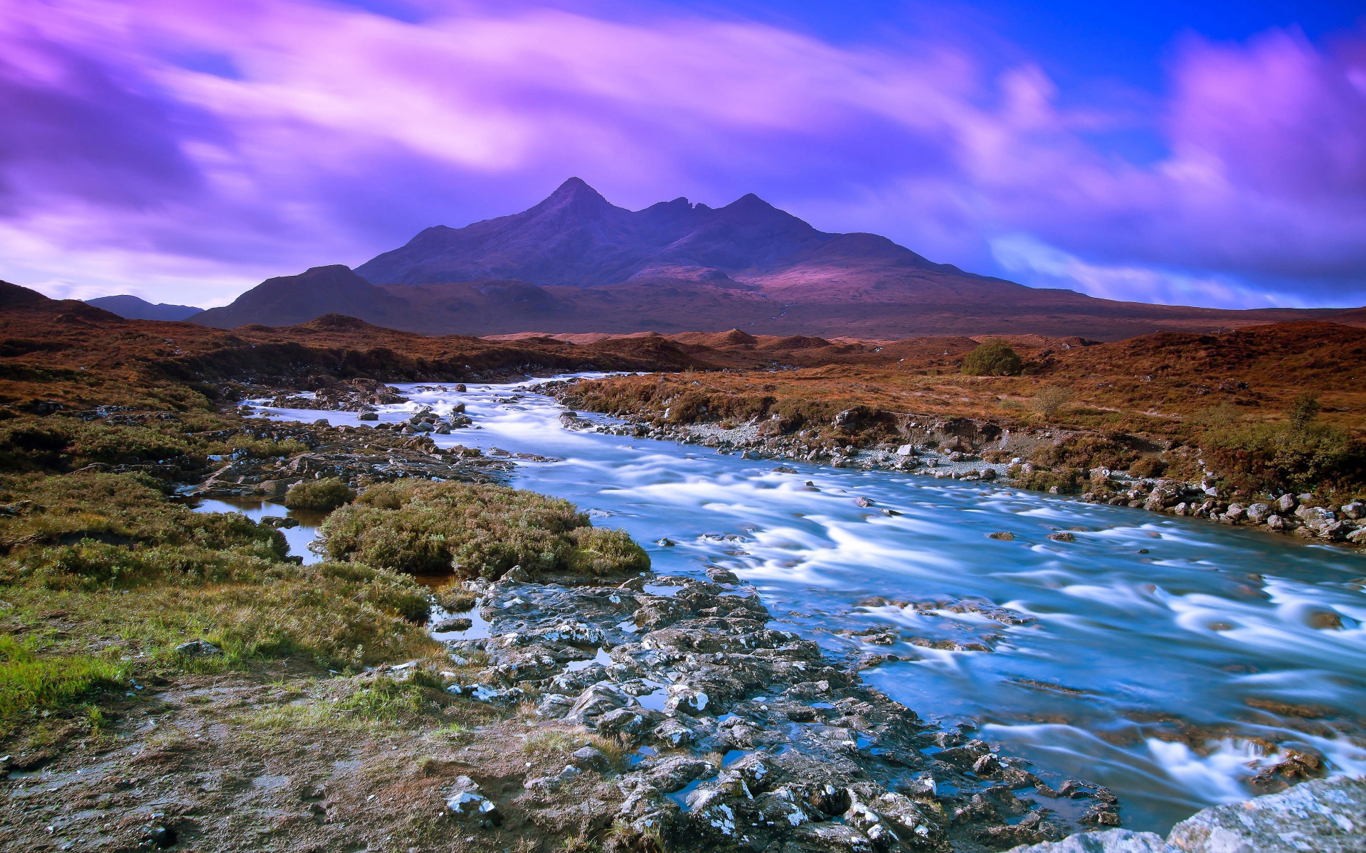 Description: A river running through a lush green valley under a purple sky with mountains in the background and a few clouds.