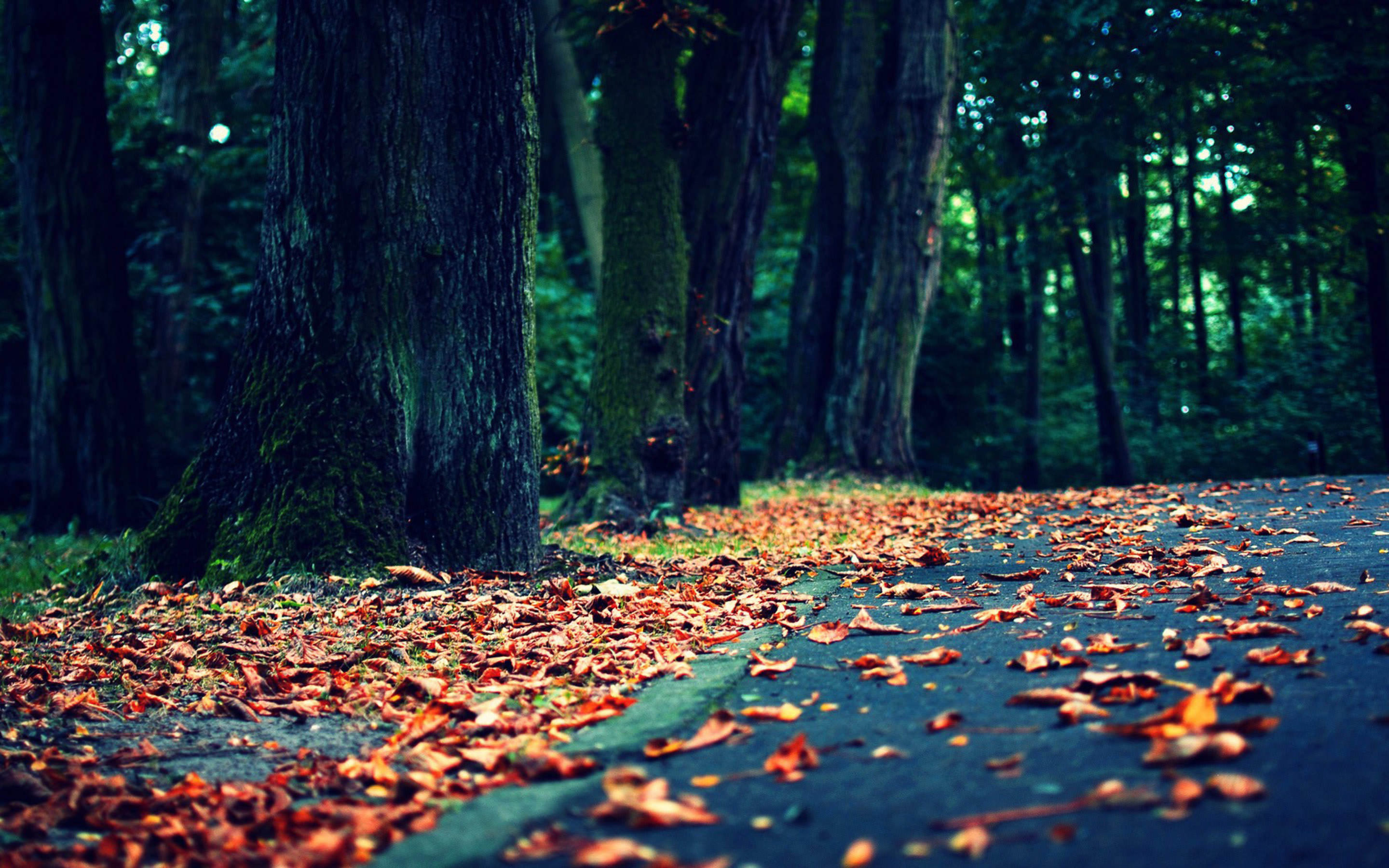 Description: A road with leaves on the ground and trees in the background with a stop sign on the side of the road.