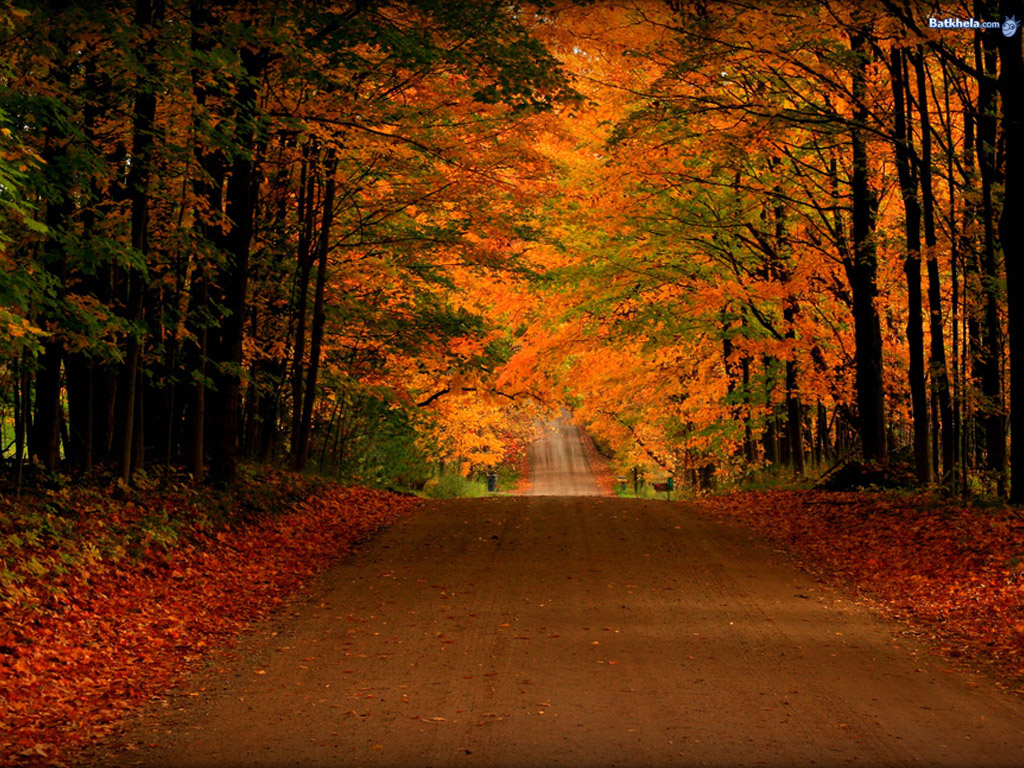 Description: A road surrounded by trees with orange leaves on it and a forest in the background with a few trees.