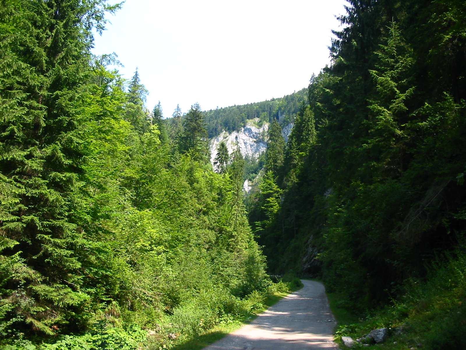 Description: A road surrounded by trees and a mountain in the background with a sky background and a few clouds in the sky.
