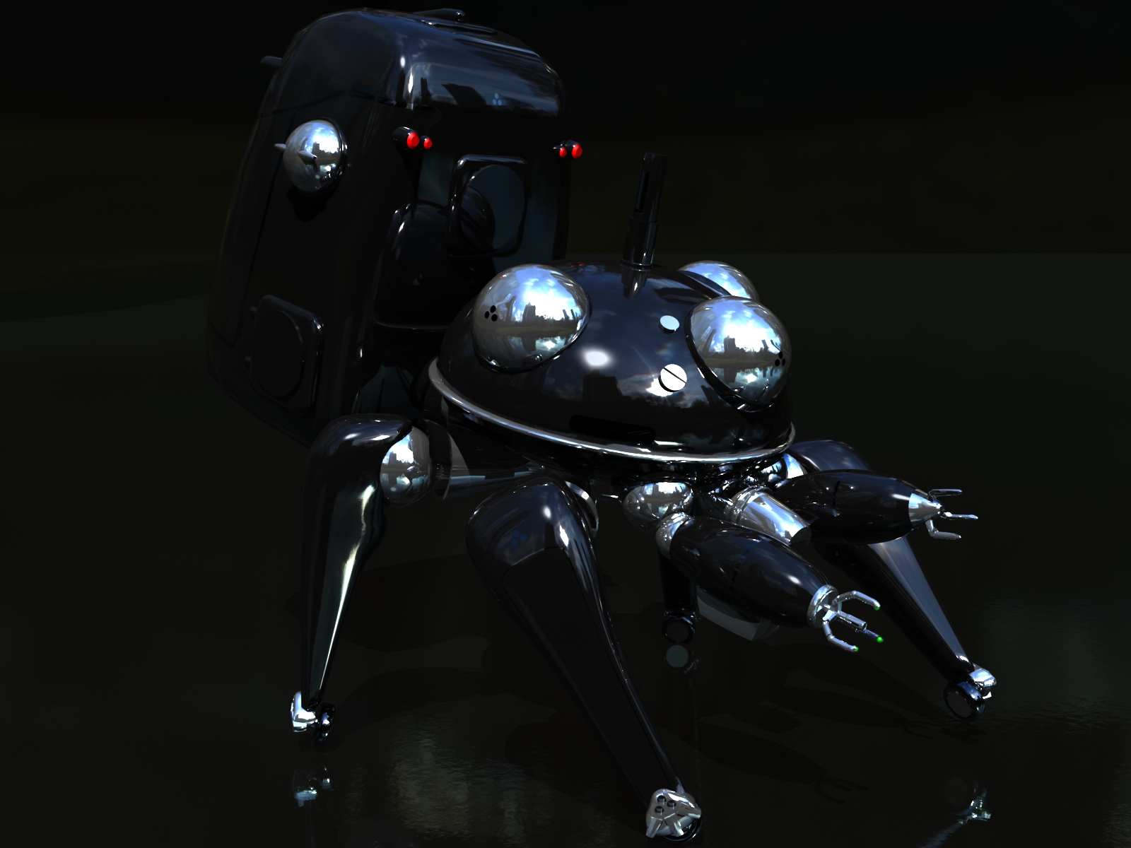Description: A robot with a backpack on its back sitting on a table with a black background and a red light.