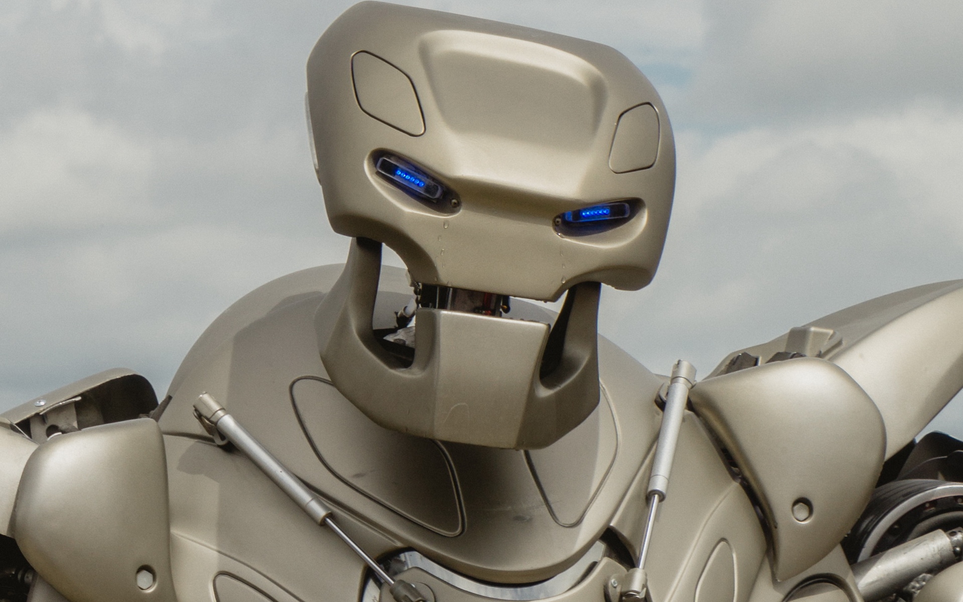 Description: A robot with blue eyes and a nose ring on it's head and arm.