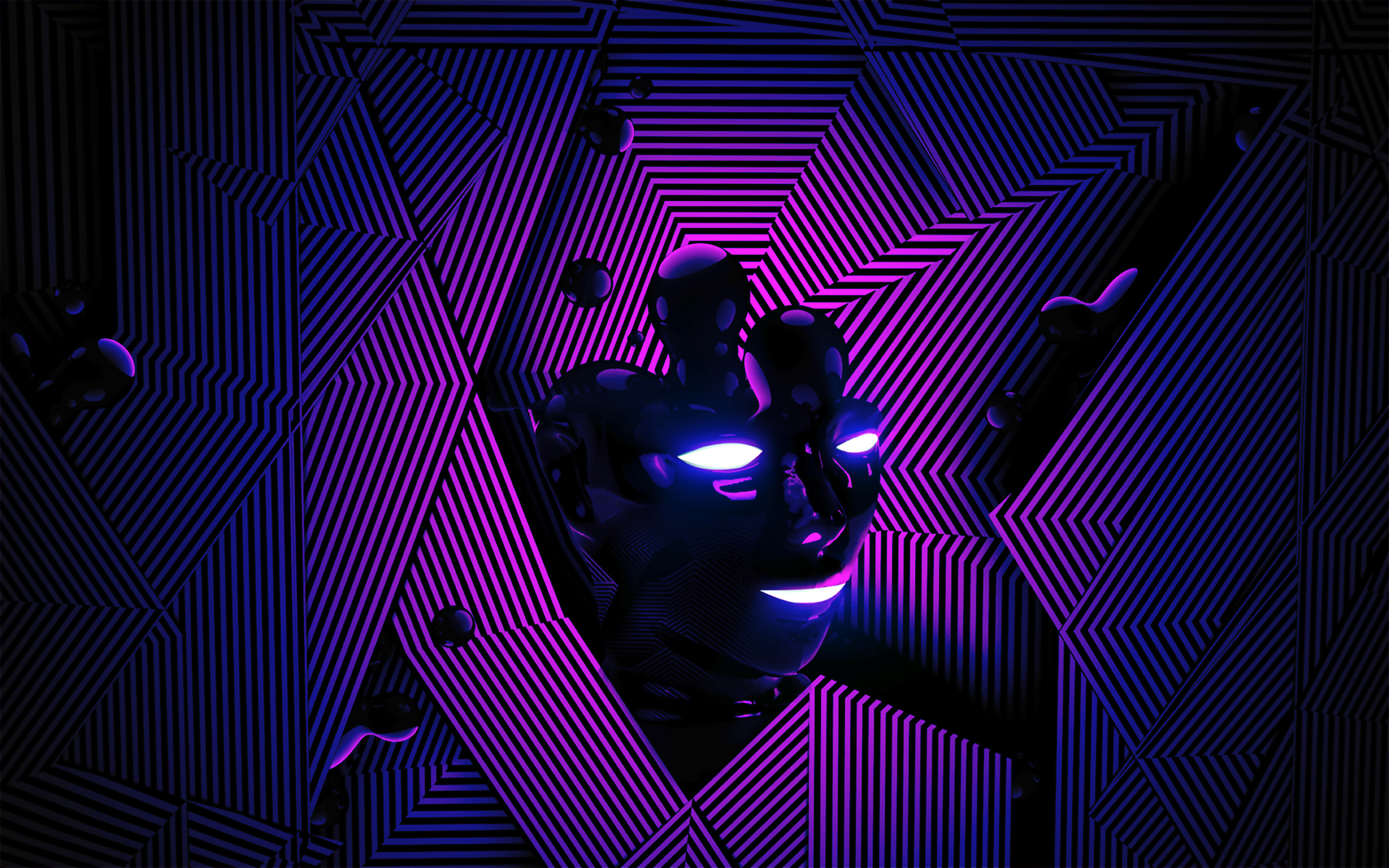 Description: A robot with glowing eyes and a purple background with a black background and a purple triangle with a black outline.