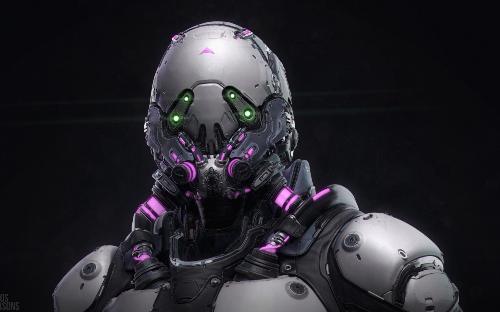 Description: A robot with green eyes and a black background is standing in front of a black backdrop and looking at the camera.