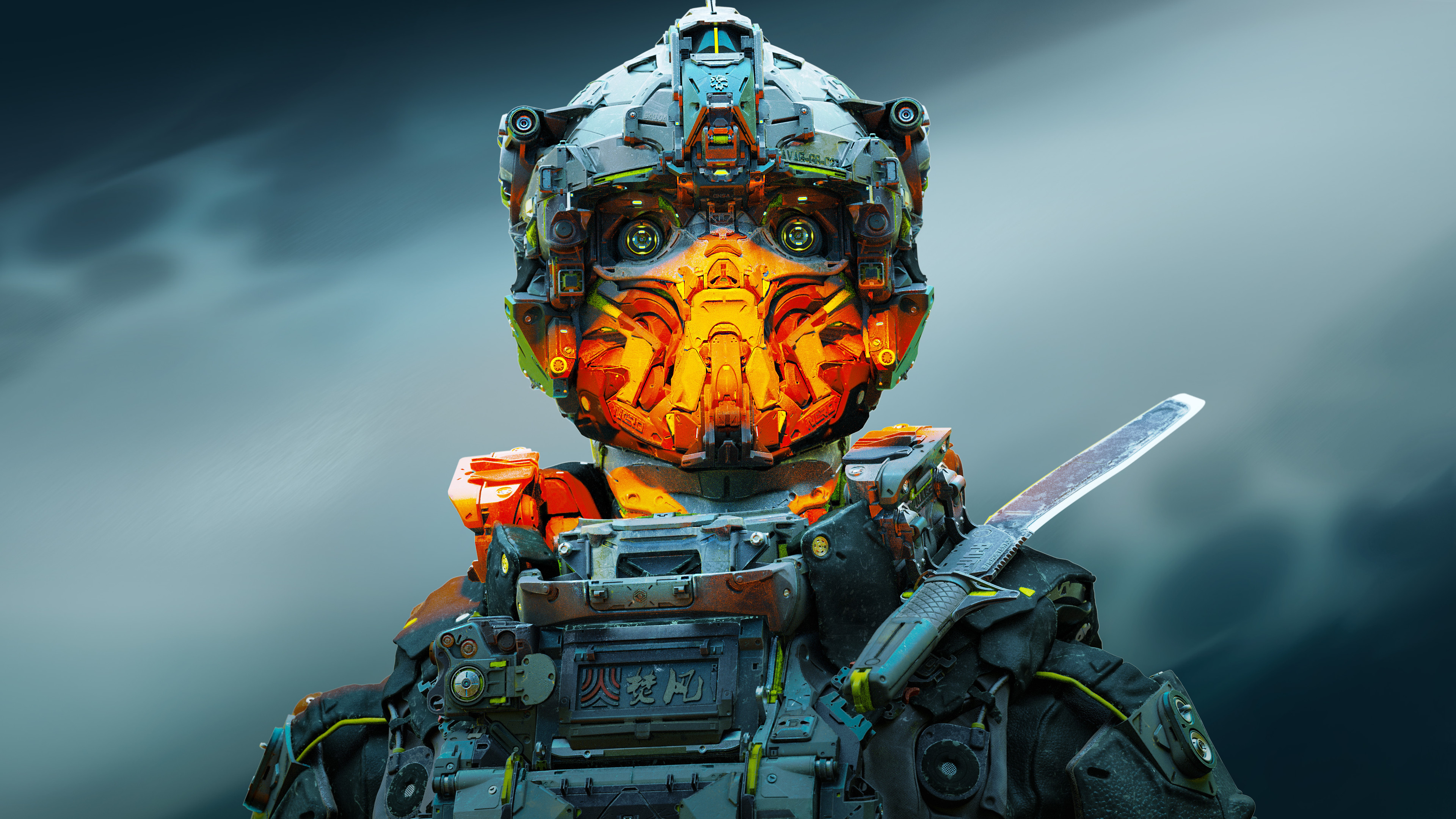 Description: A robot with a large knife in his hand and a fire face on his face.