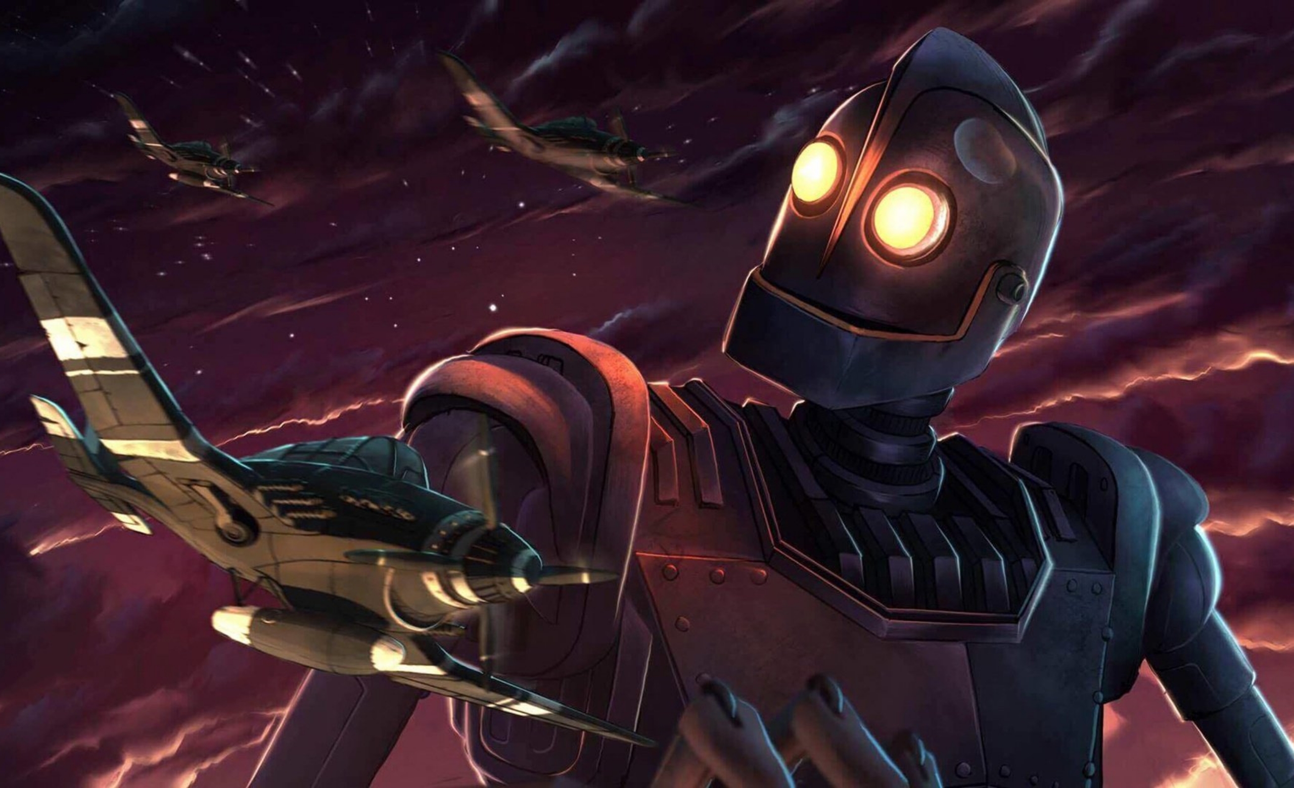 Description: A robot with a light on his head and a plane in the sky behind him.