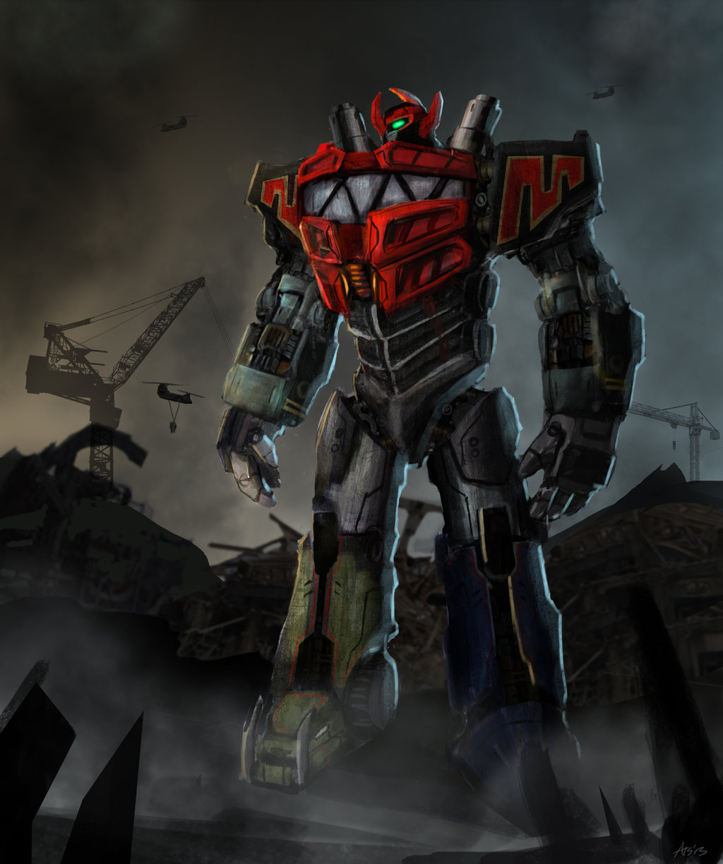 Description: A robot with a red and yellow face standing in a dark area with smoke and smoke behind it.