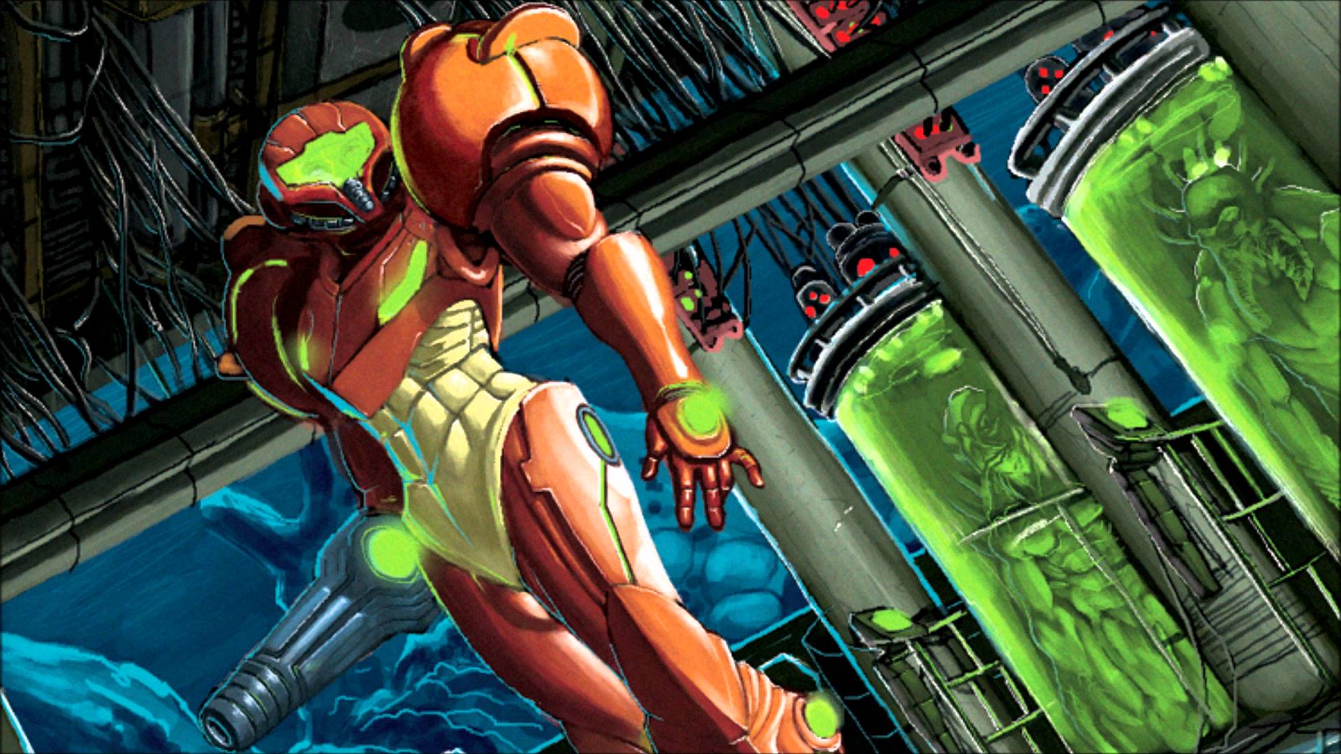 Description: A painting of a robot in a room with a giant green object in it's hand and a giant green object in the background.