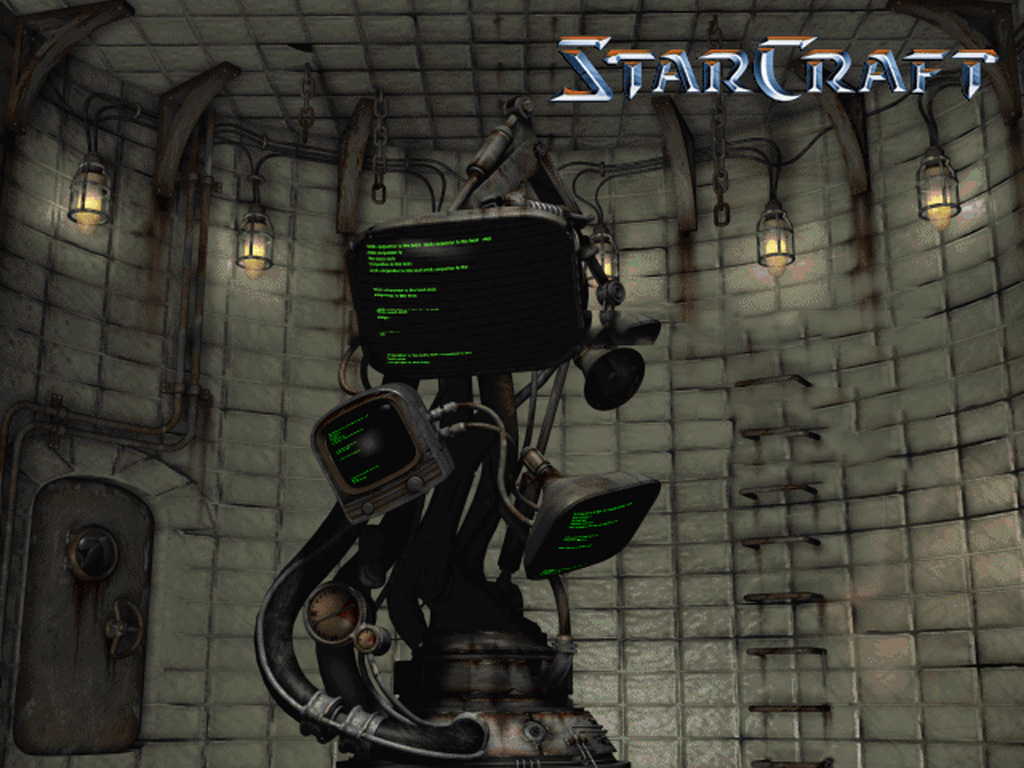 Description: A computer generated image of a robot in a room with a wall of tiles and lights on it's sides.
