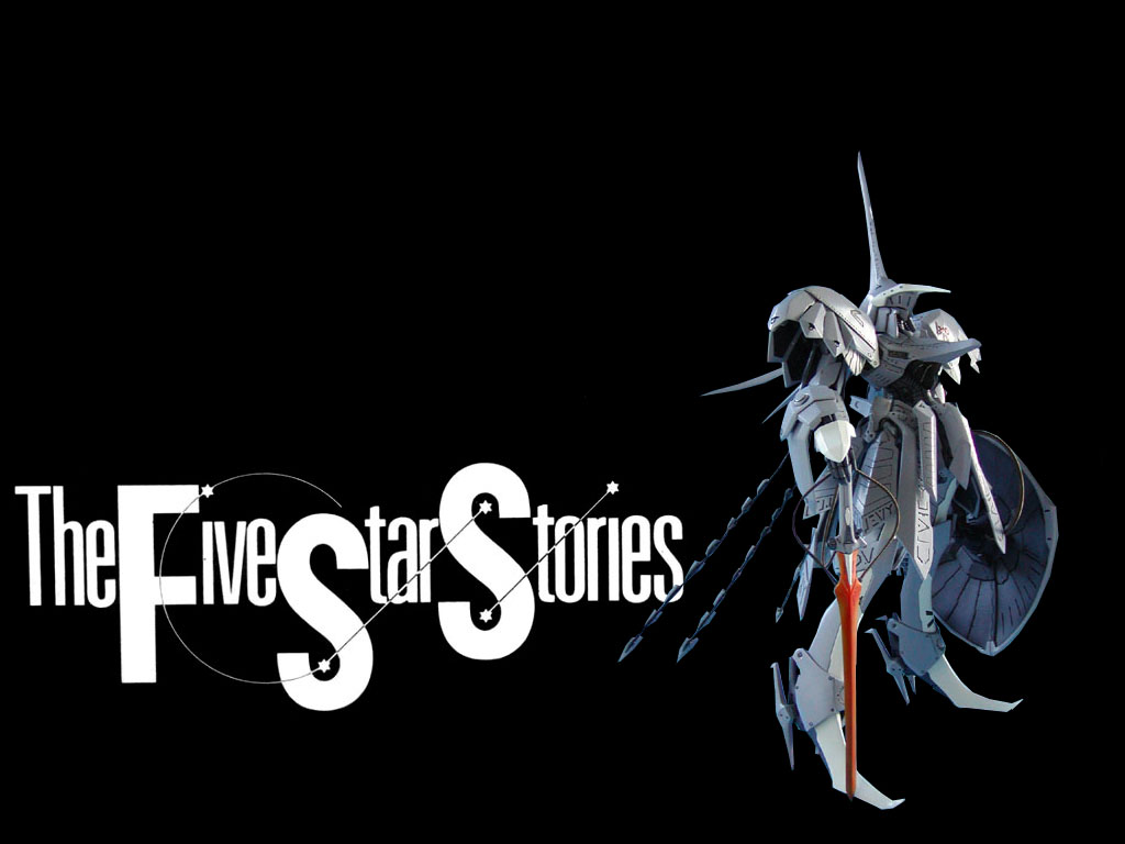 Description: A black and white photo of a robot with a sword and the words the five star stories on it.