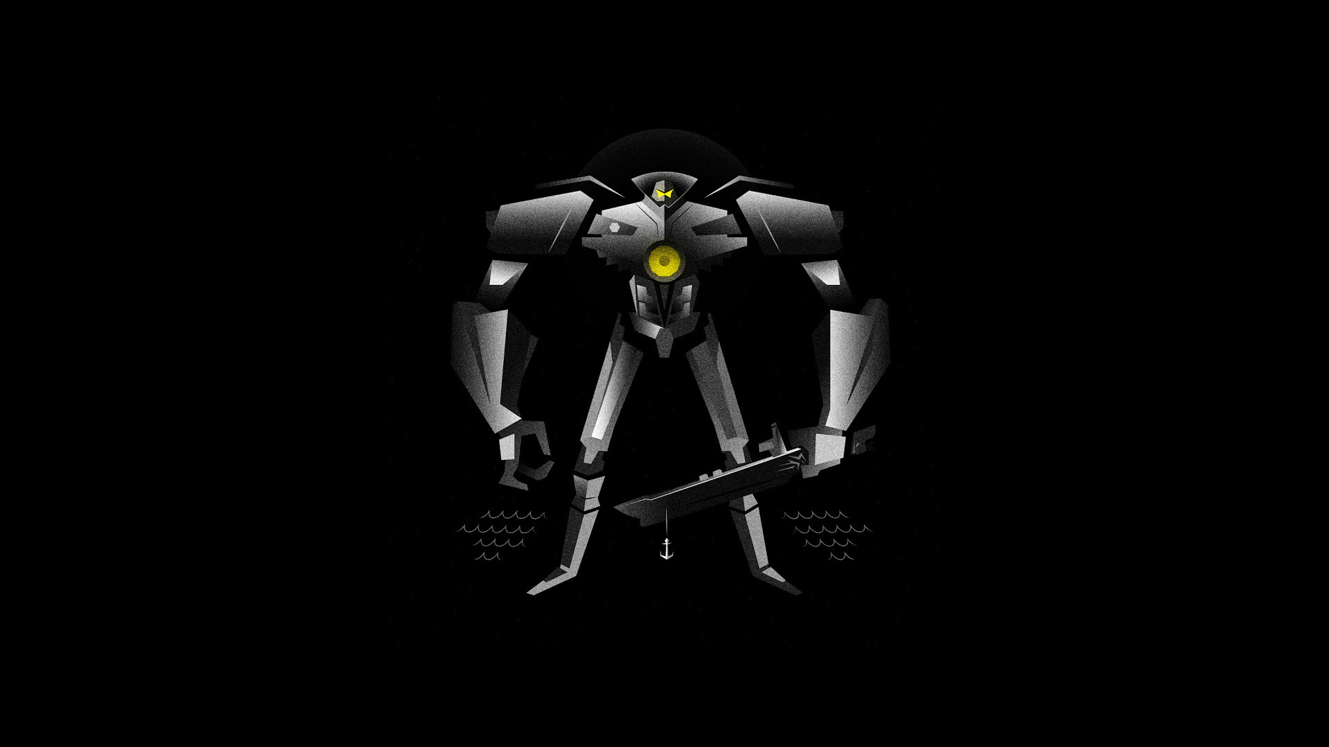 Description: A robot with a yellow eye standing in the dark with a skateboard in his hand and a black background.