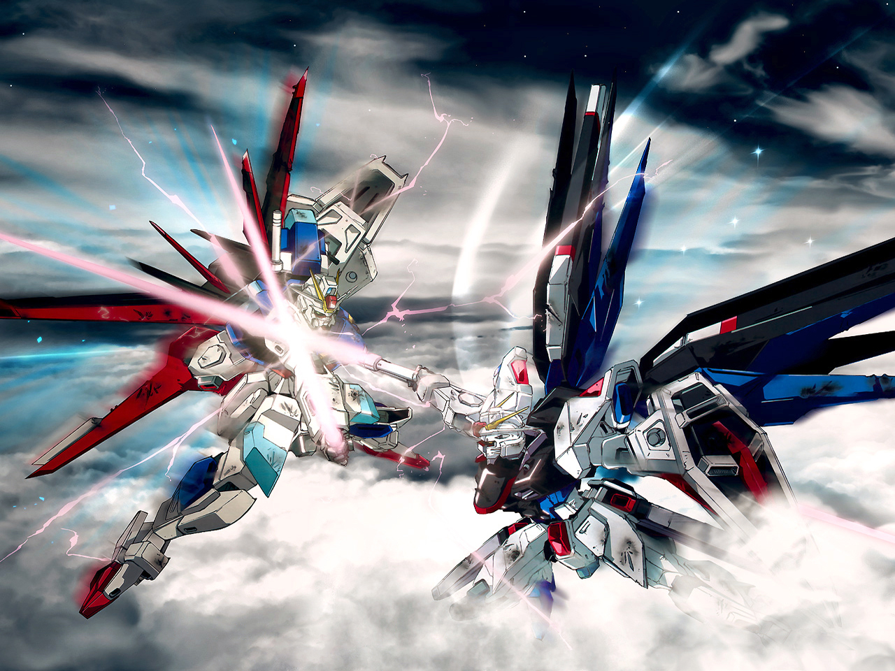 Description: Two robots fighting in the clouds with each other in the sky with lightnings behind them and a sky background.