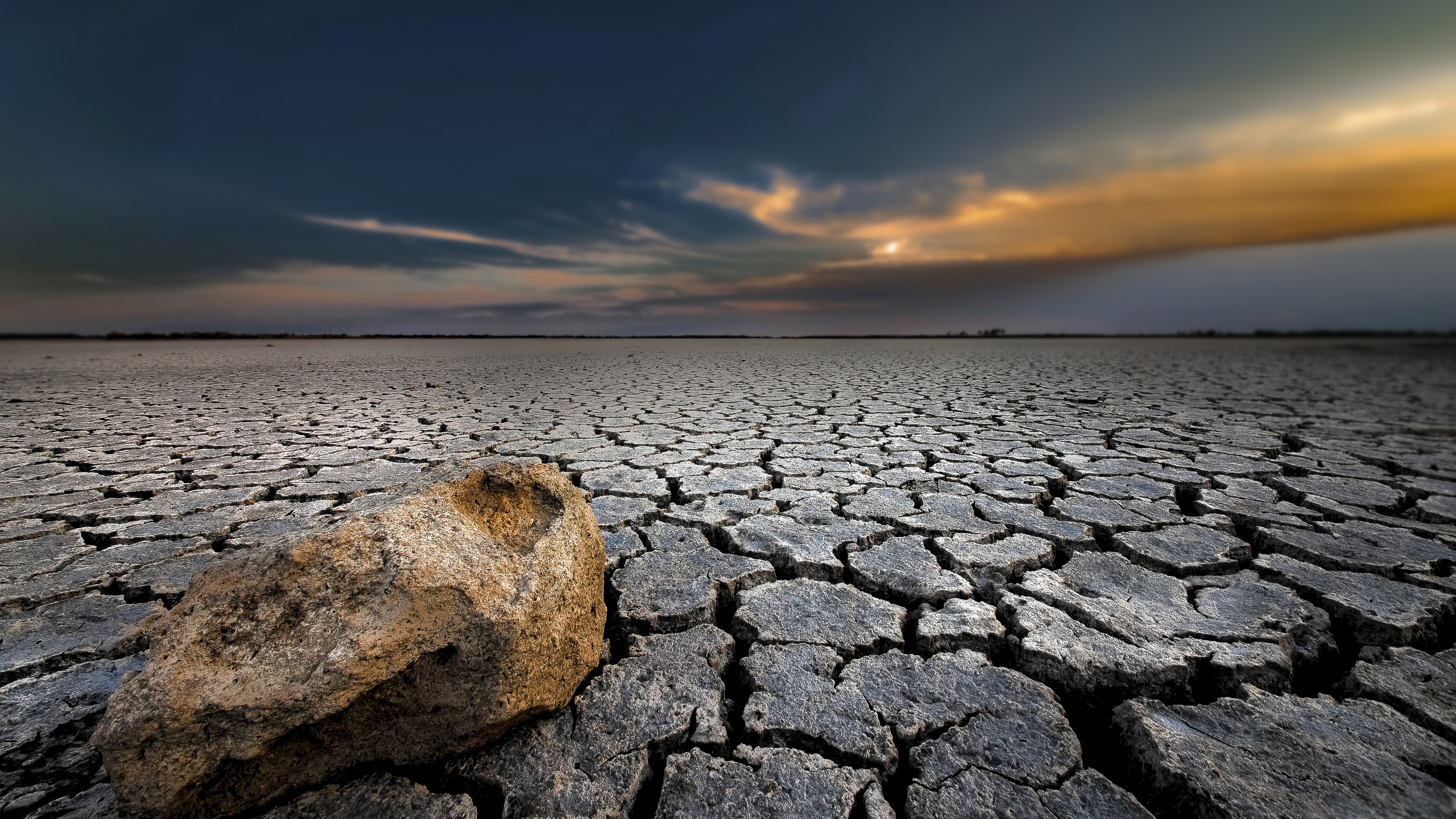 Description: A rock sitting on top of a dry grass field under a cloudy sky with a sun setting in the distance.