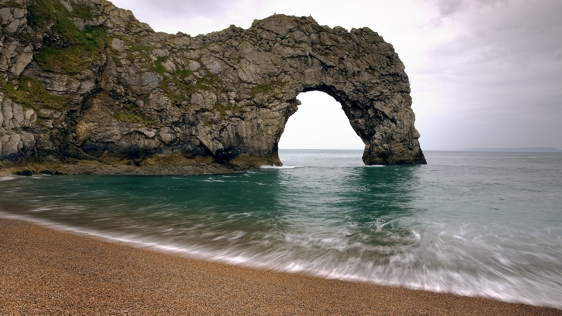 Description: A rock formation in the ocean with a beach below it and a wave coming in from the water below.