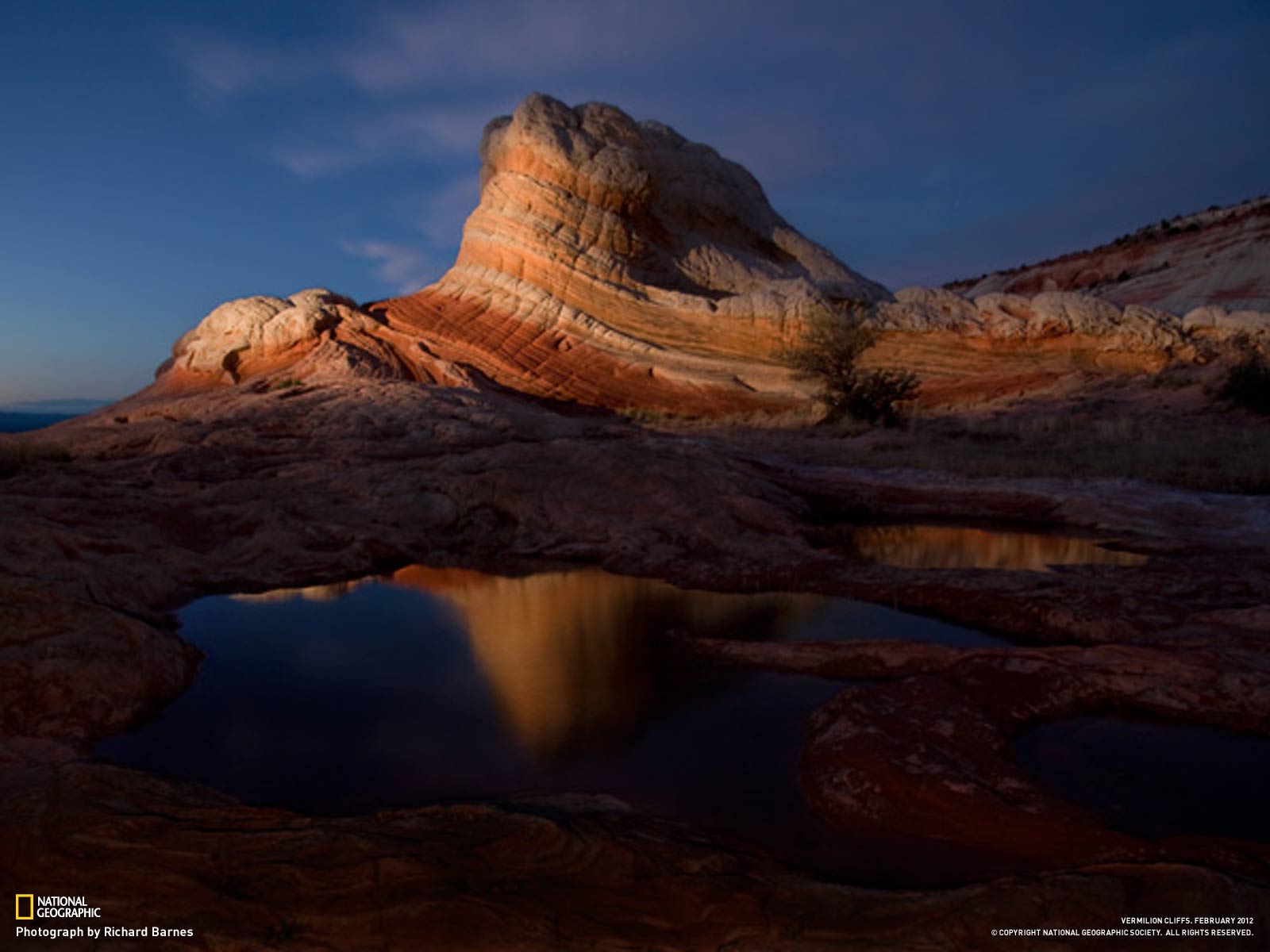 Description: A rock formation with a reflection of a mountain in the water at sunset or dawn or dawn or dawn.