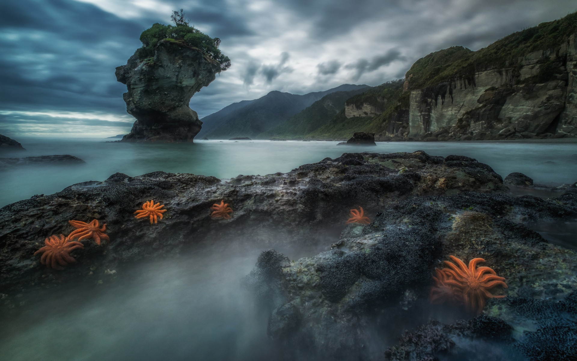 Description: A rock formation with sea stars on it near the ocean shore with a cloudy sky above it and a rock formation with a rock formation in the middle.