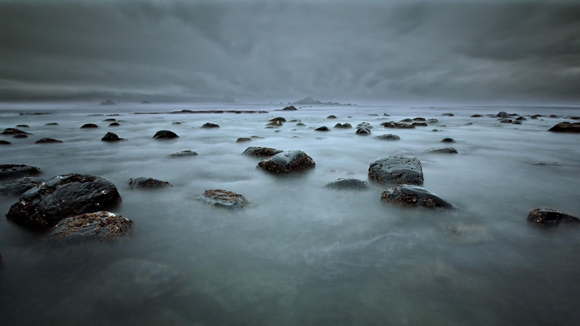 Description: A group of rocks sitting on top of a beach under a cloudy sky with a sky background and a few clouds.
