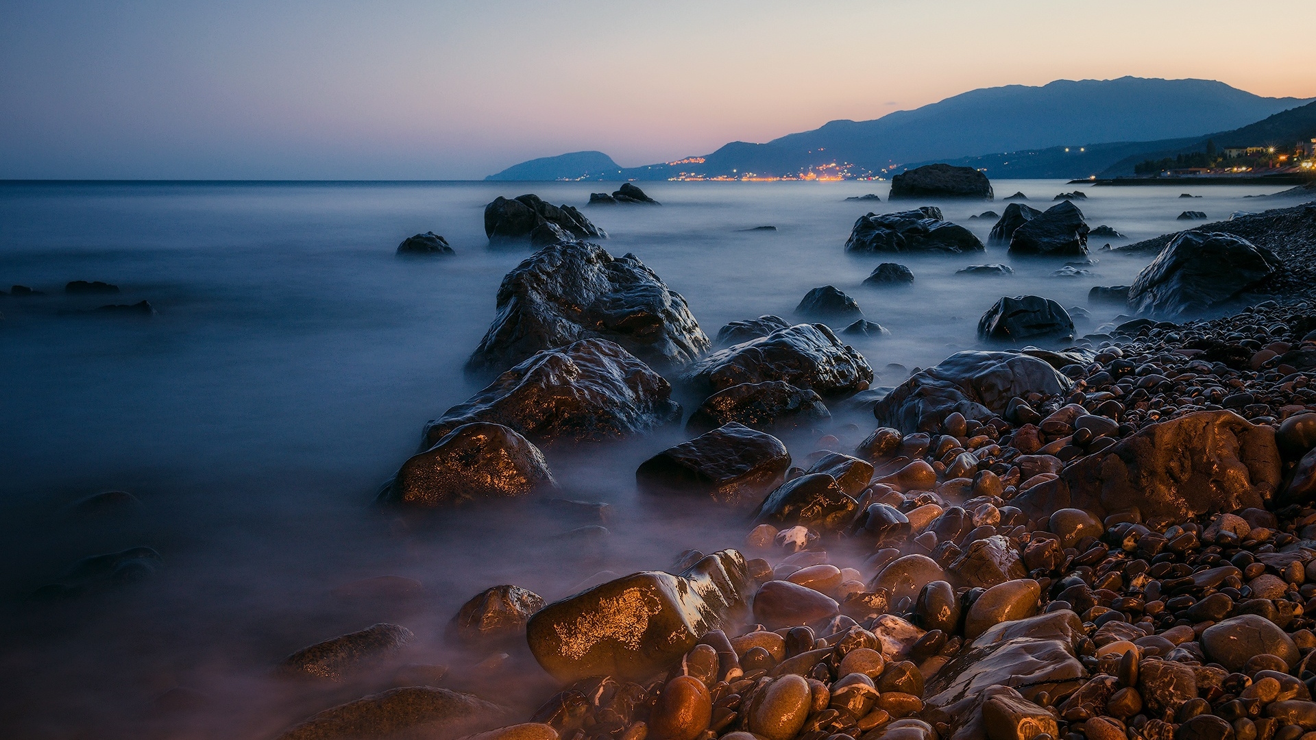 Description: A rocky beach with a mountain in the background at dusk with a long exposure of water and rocks in the foreground.