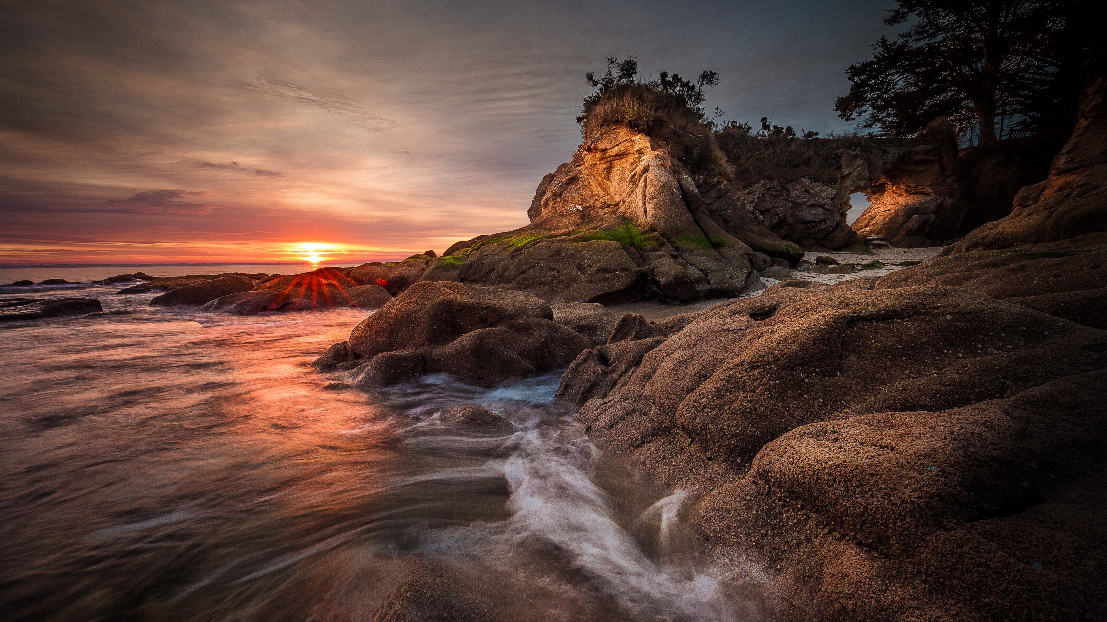 Description: A rocky beach with a sunset in the background and a small tree on the cliff face in the foreground.