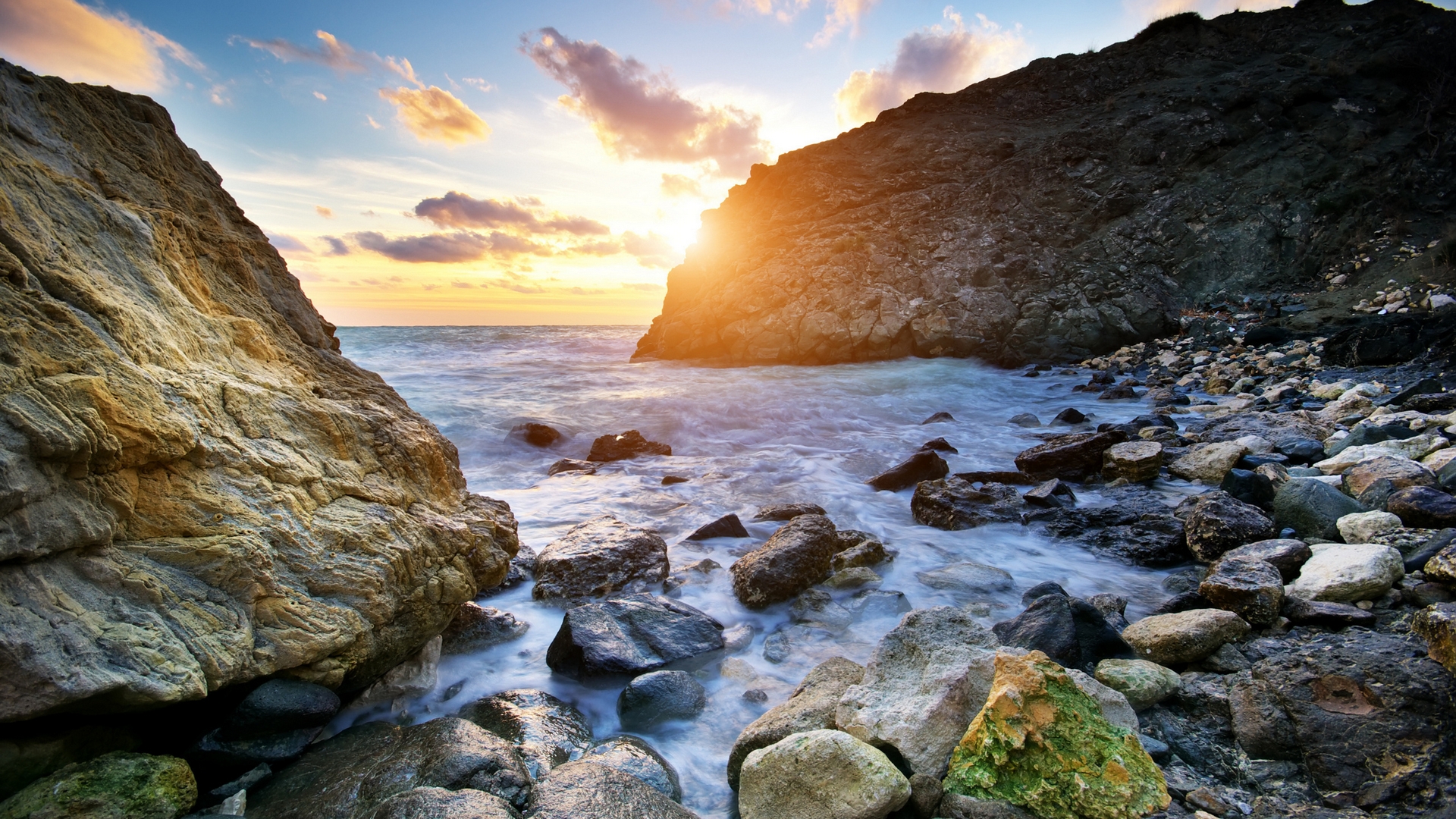 Description: A rocky beach with a sunset in the background and a rock outcropping in the foreground.