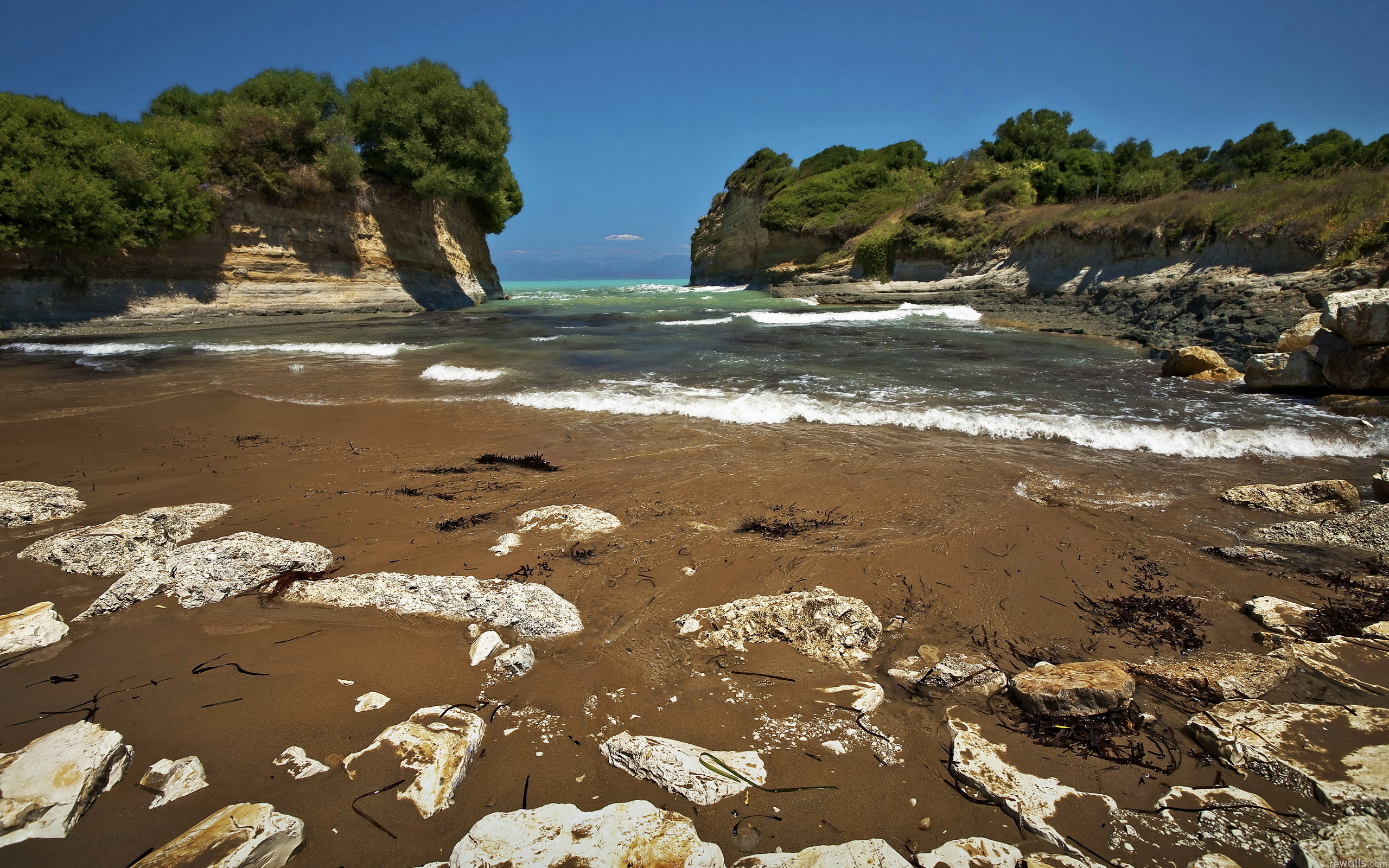 Description: A rocky beach with a few trees and water in the background and a cliff in the foreground with a body of water in the middle.