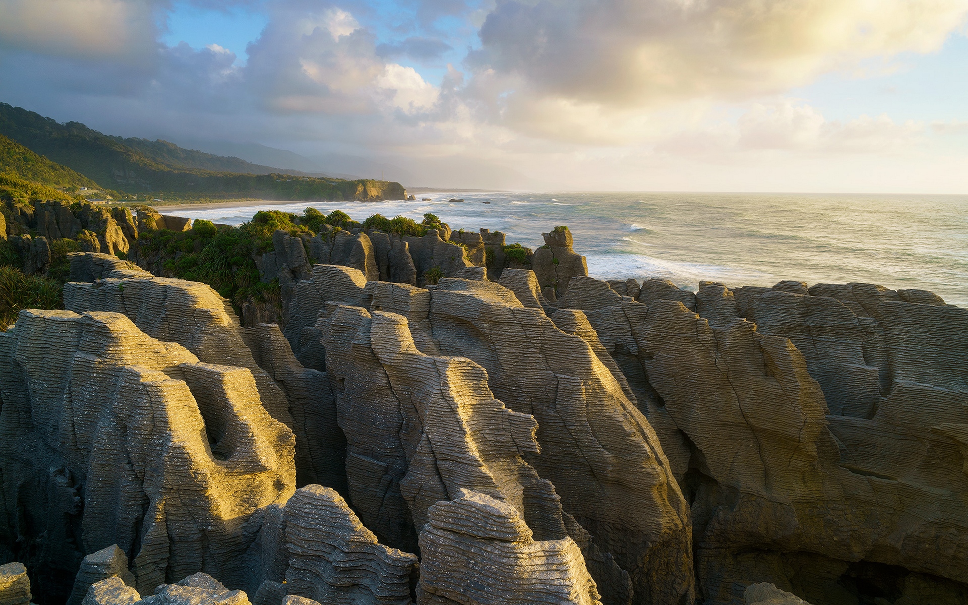 Description: A rocky cliff with a beach in the background and a body of water in the foreground with a cloudy sky.