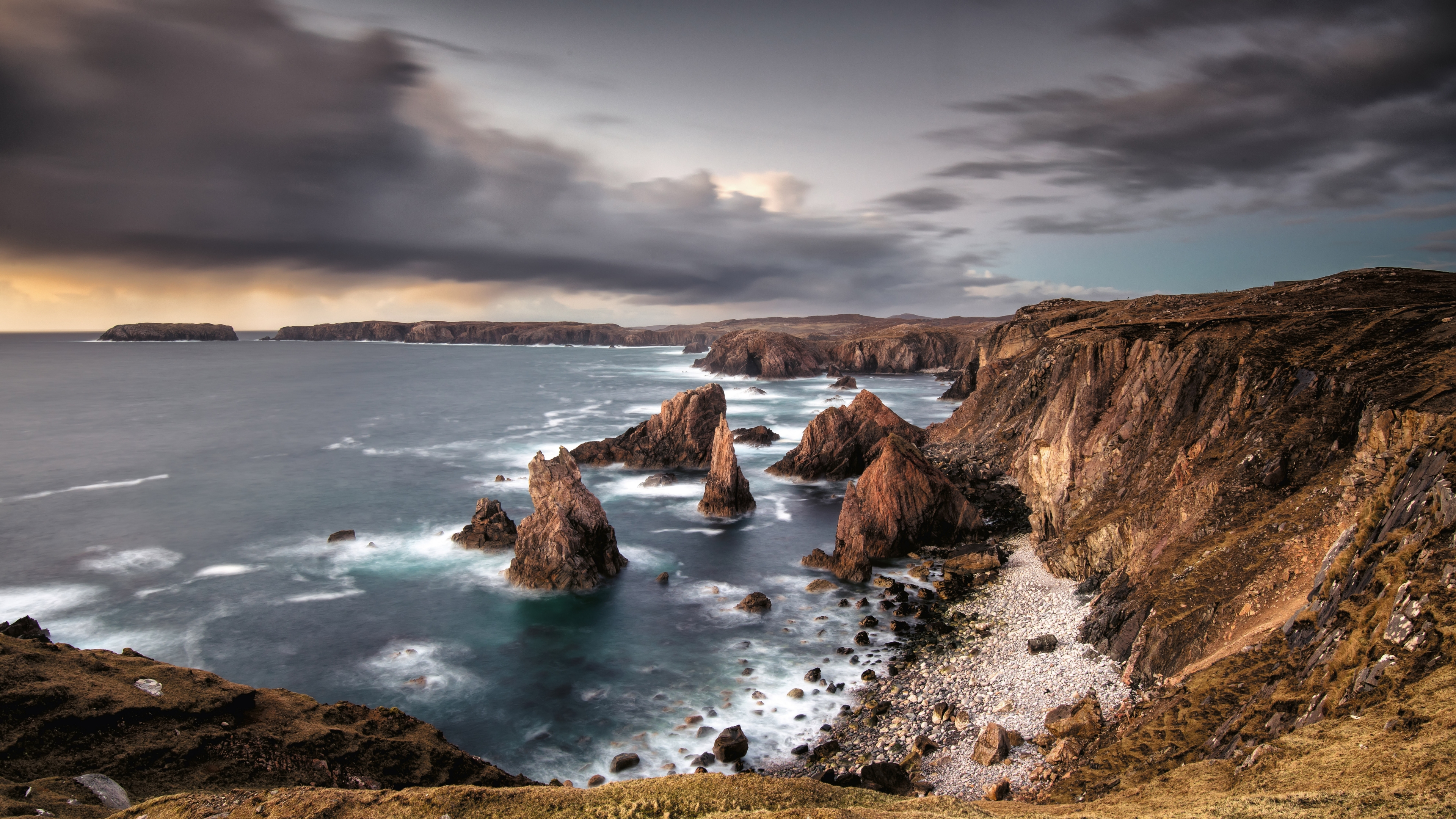 Description: A rocky cliff with a body of water and a few rocks sticking out of it's sides under a cloudy sky.