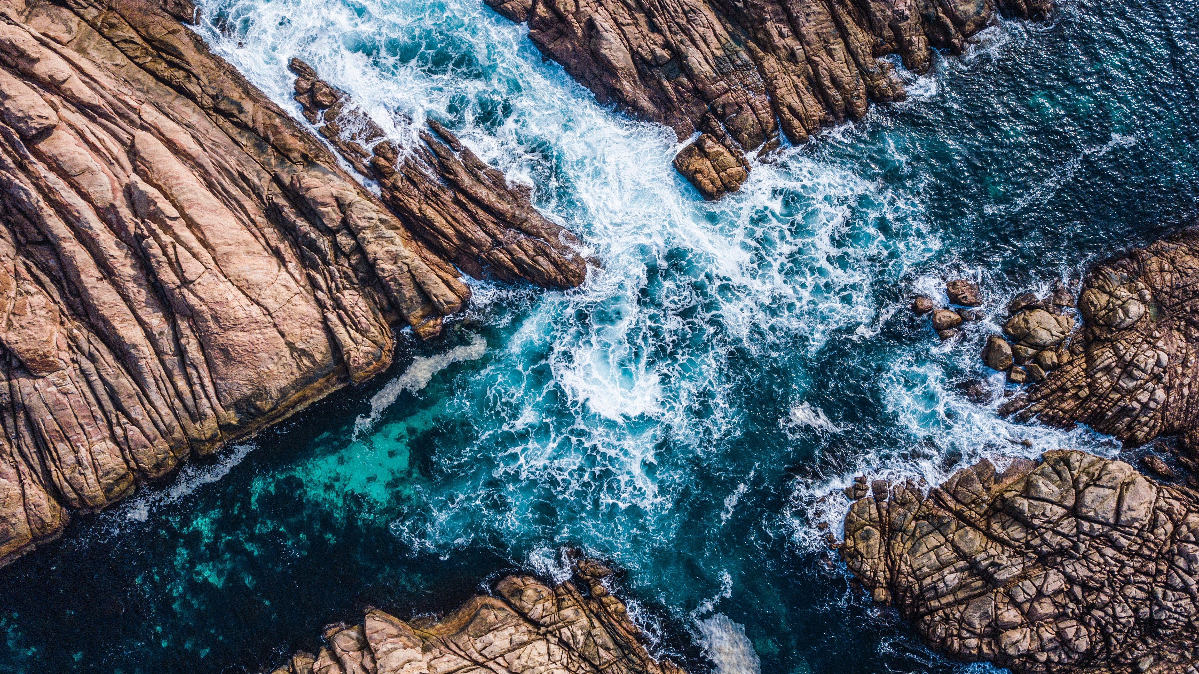 Description: A view of a rocky coastline with a body of water surrounded by rocks and a blue ocean below it.
