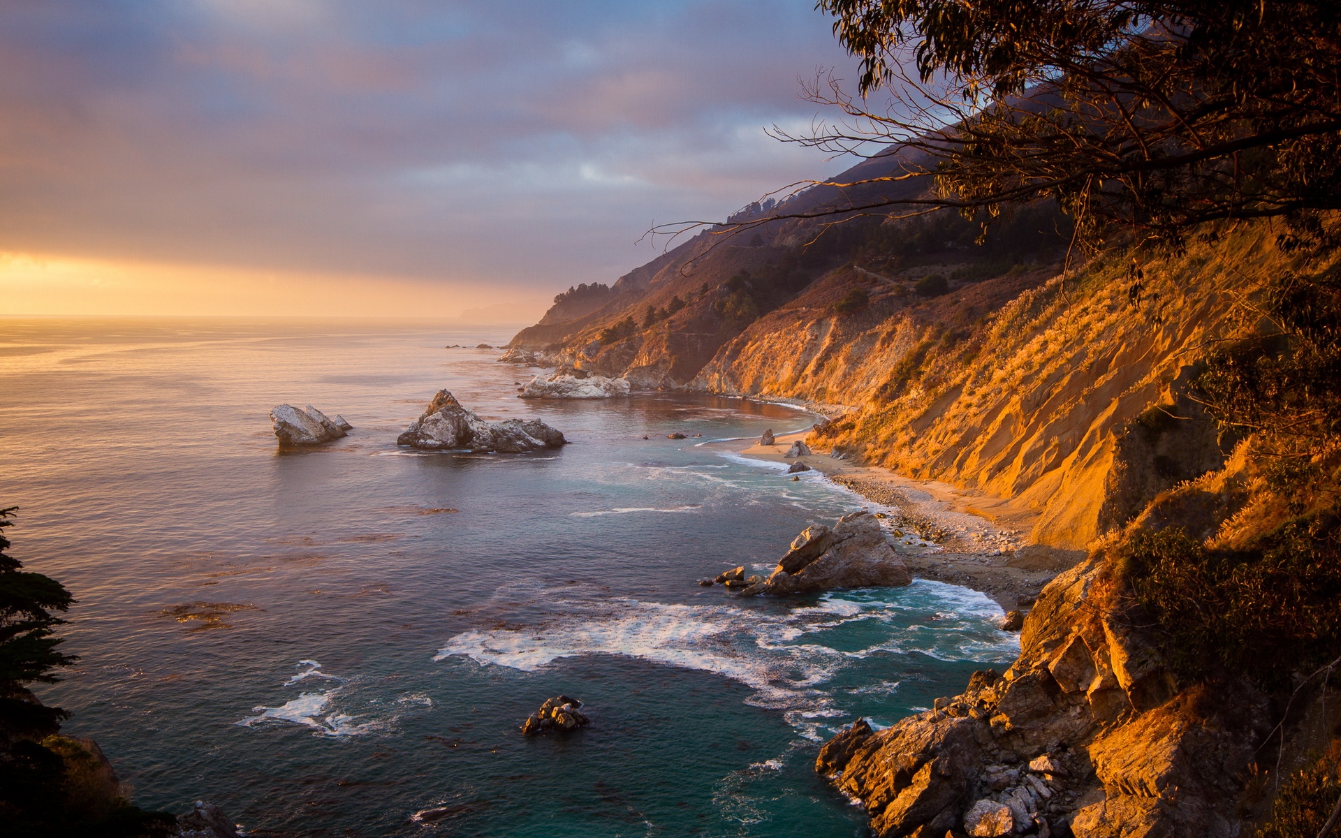 Description: A view of a rocky coastline with a sunset in the background and a few waves crashing on the rocks.