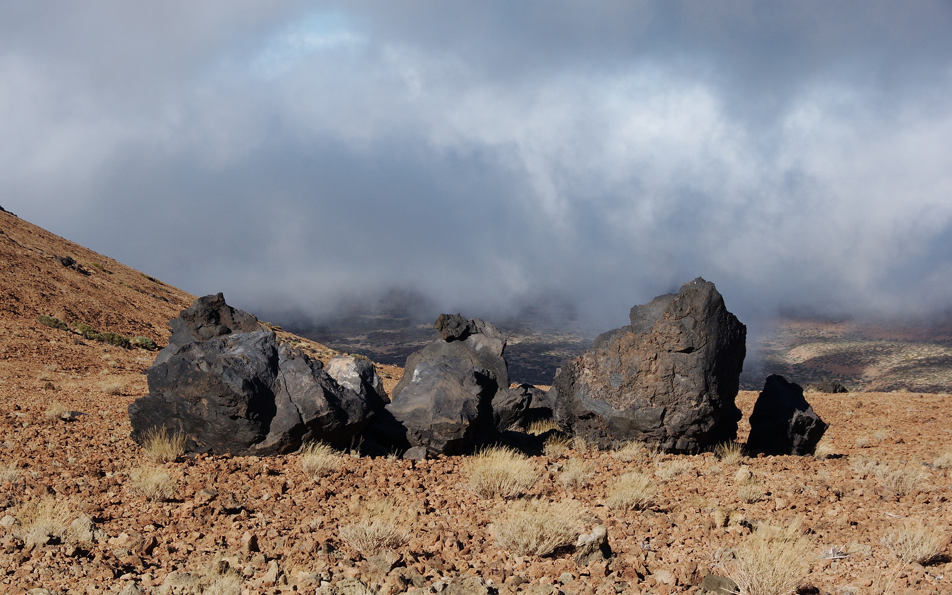 Description: A group of rocks sitting on top of a dry grass field next to a hill covered in clouds and dirt.