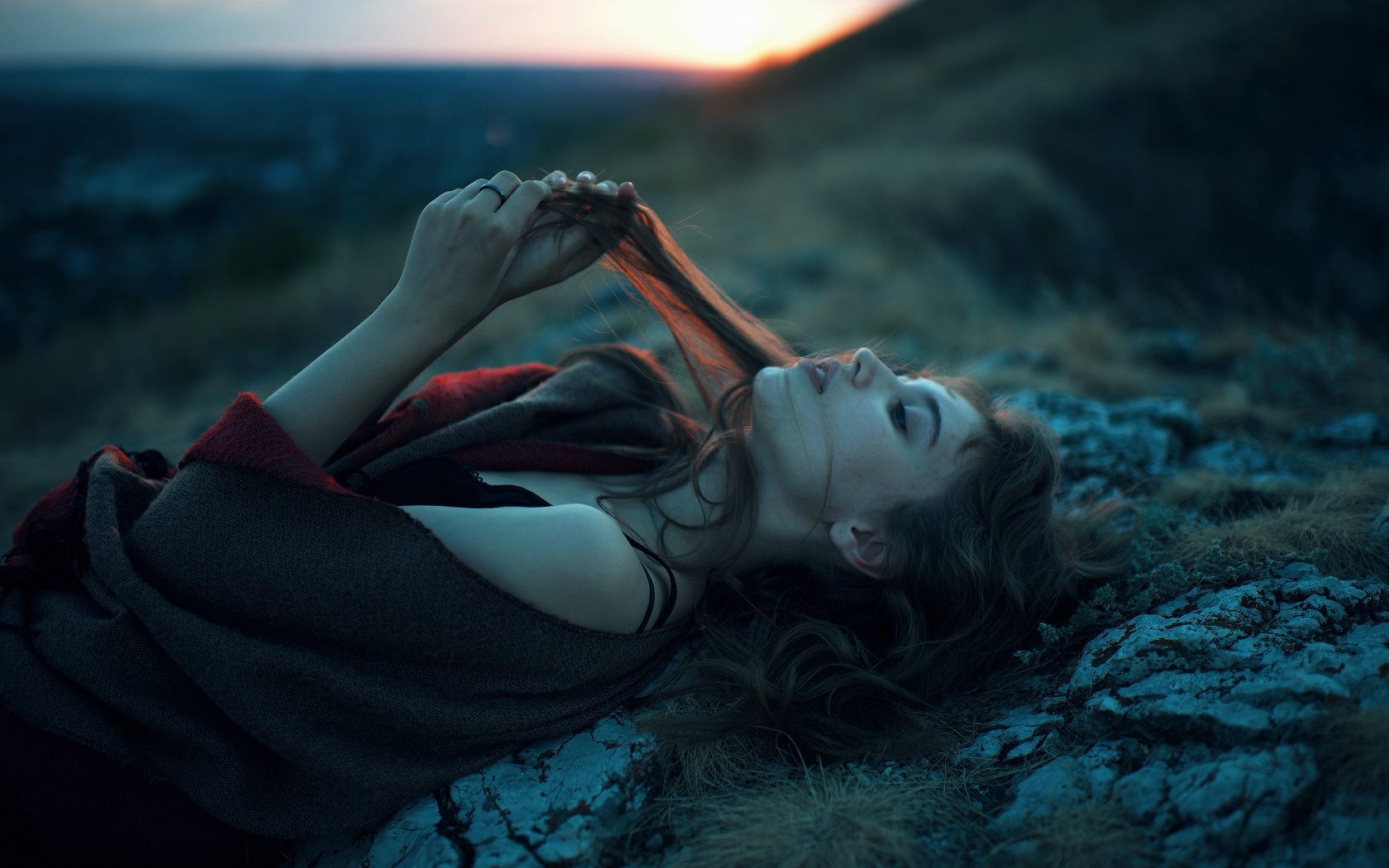 Description: A woman laying on a rocky hillside with her eyes closed and her hair in the air.