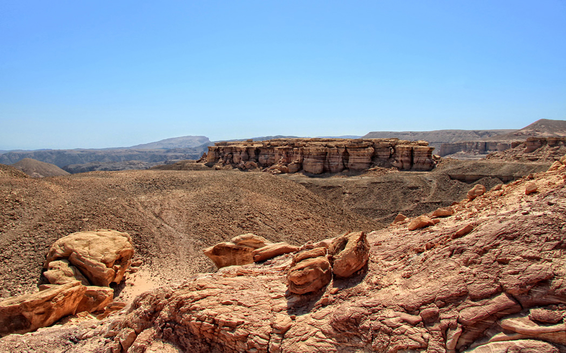 Description: A rocky landscape with a mountain in the background and a blue sky above it with a few clouds in the distance.