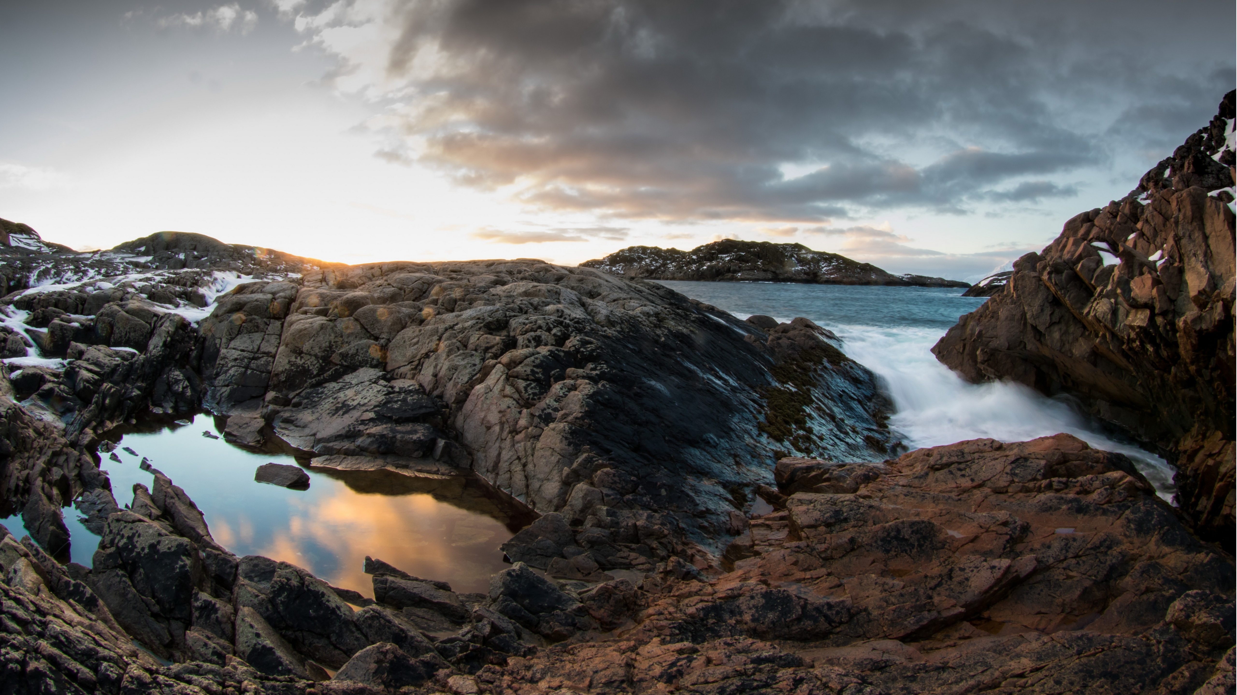 Description: A rocky shore with a body of water surrounded by rocks and snow covered ground with a cloudy sky in the background.