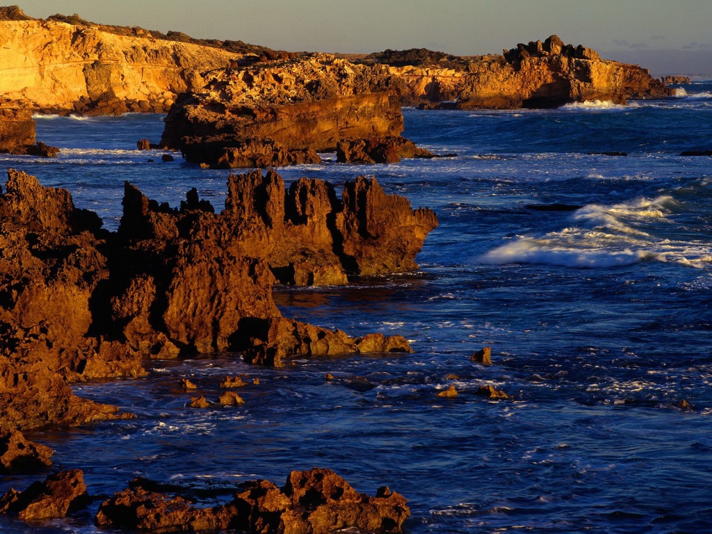 Description: A rocky shore with waves crashing against the rocks and a lighthouse in the distance on a sunny day with a blue sky.