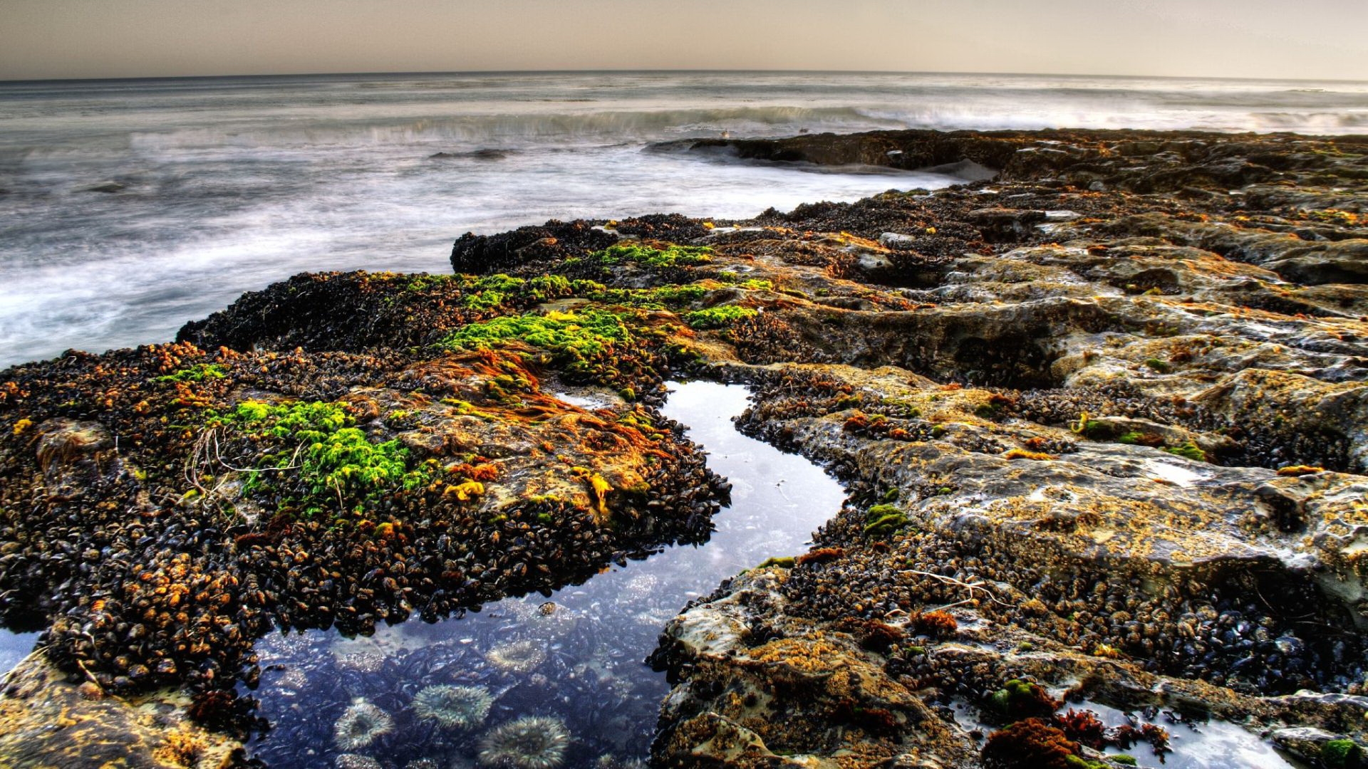 Description: A rocky shore with a body of water and a patch of green moss growing on it's rocks.
