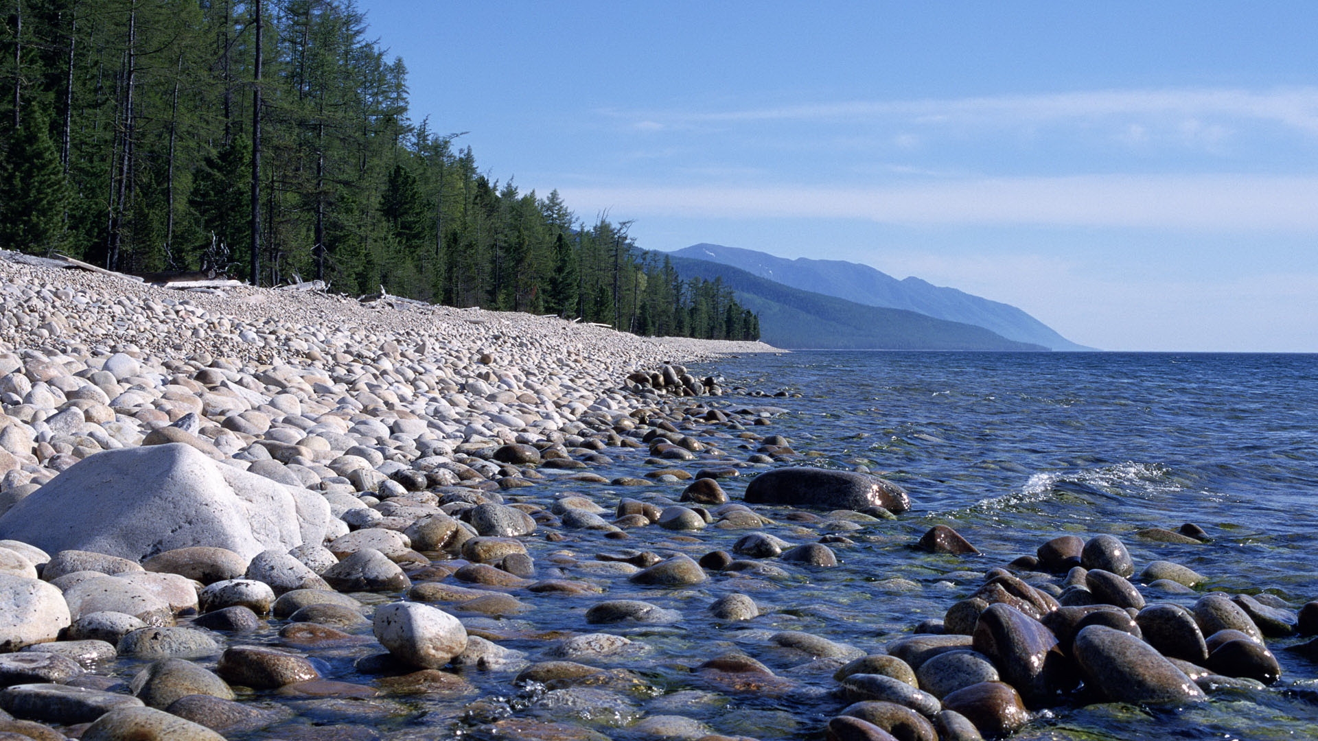 Description: A rocky shore line with trees and water in the background and a mountain range in the distance with a blue sky.
