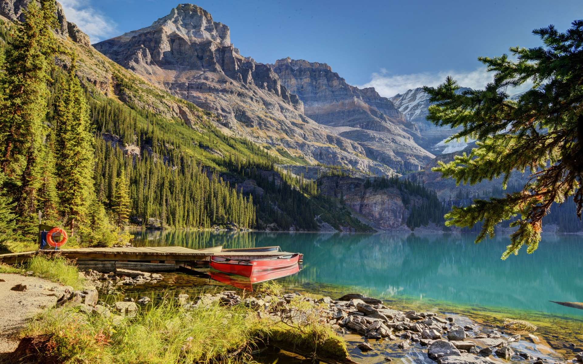 Description: A boat is docked on a rocky shore near a mountain lake with a mountain in the background and a forest in the foreground.