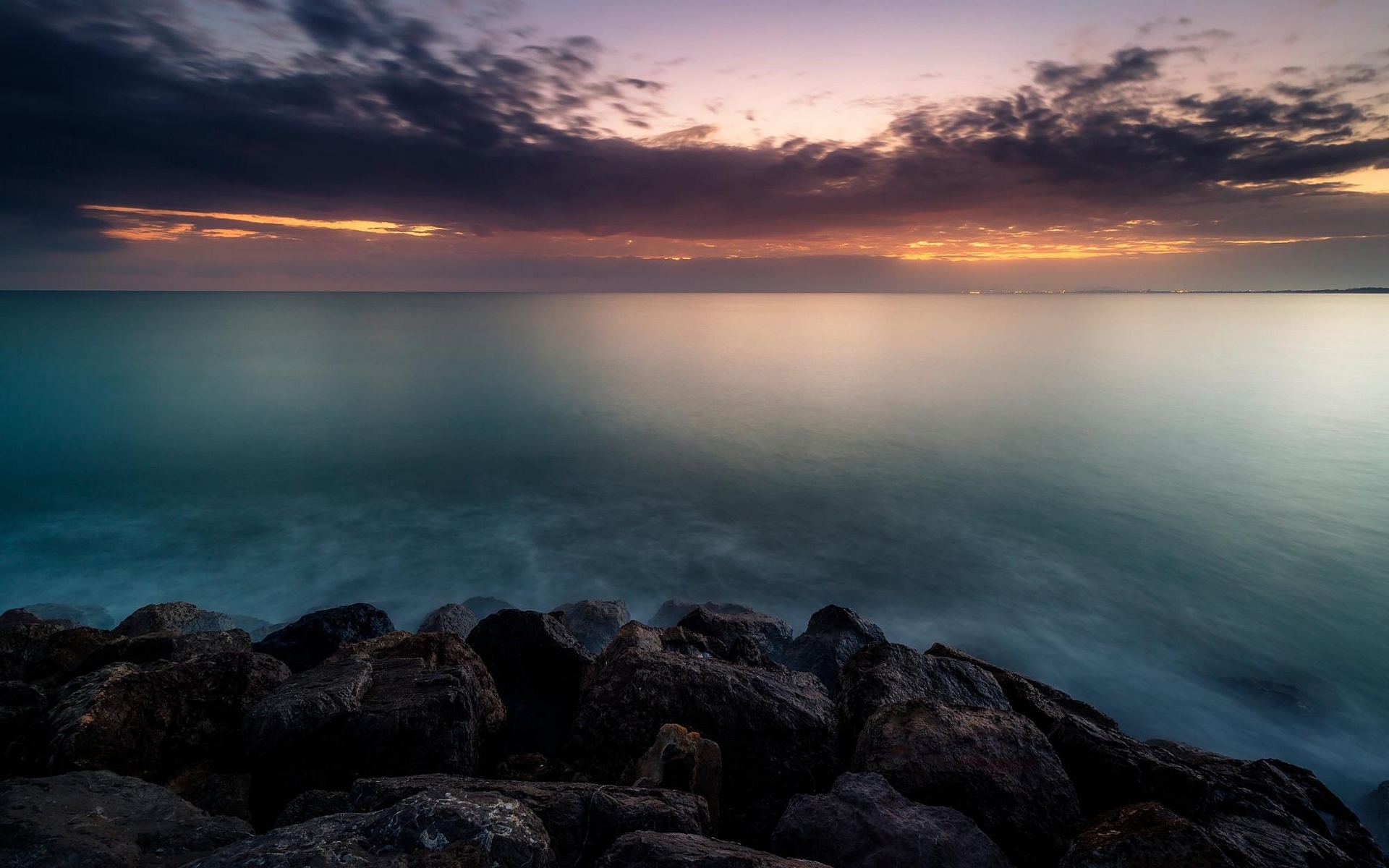 Description: A rocky shore with a sunset in the background and a body of water with rocks in the foreground.