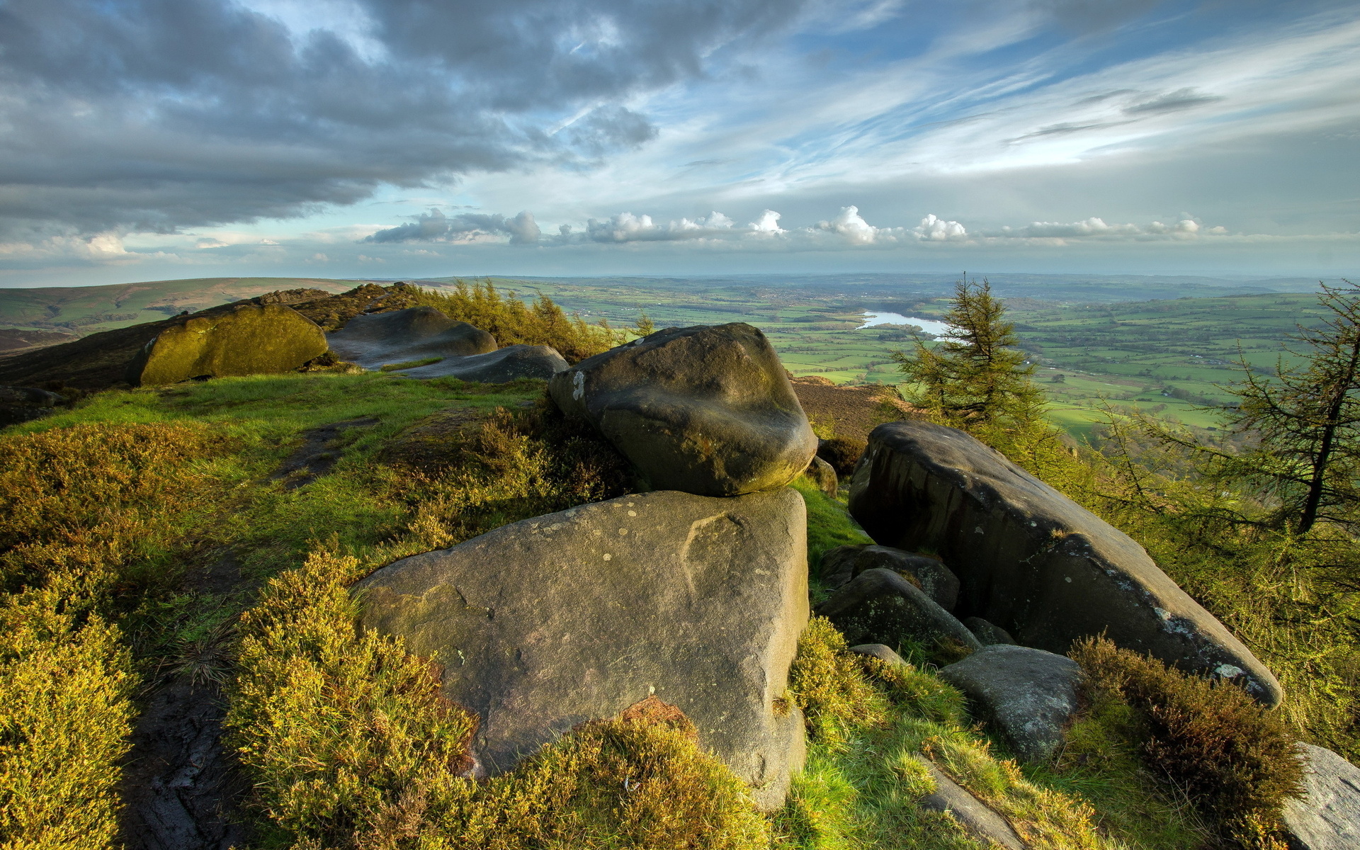 Description: A rocky outcropping with a view of a valley and a lake in the distance with a cloudy sky.