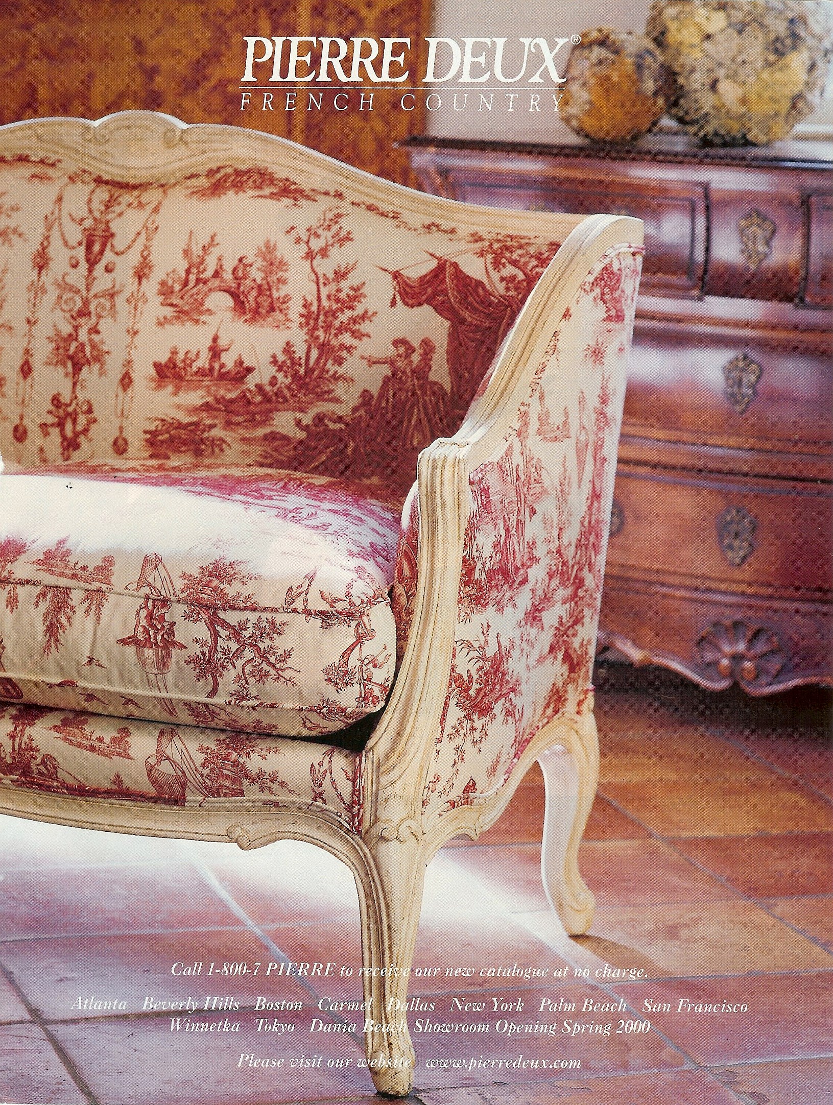 Description: A chair with a red and white pattern on it and a dresser in the background with a mirror on it.
