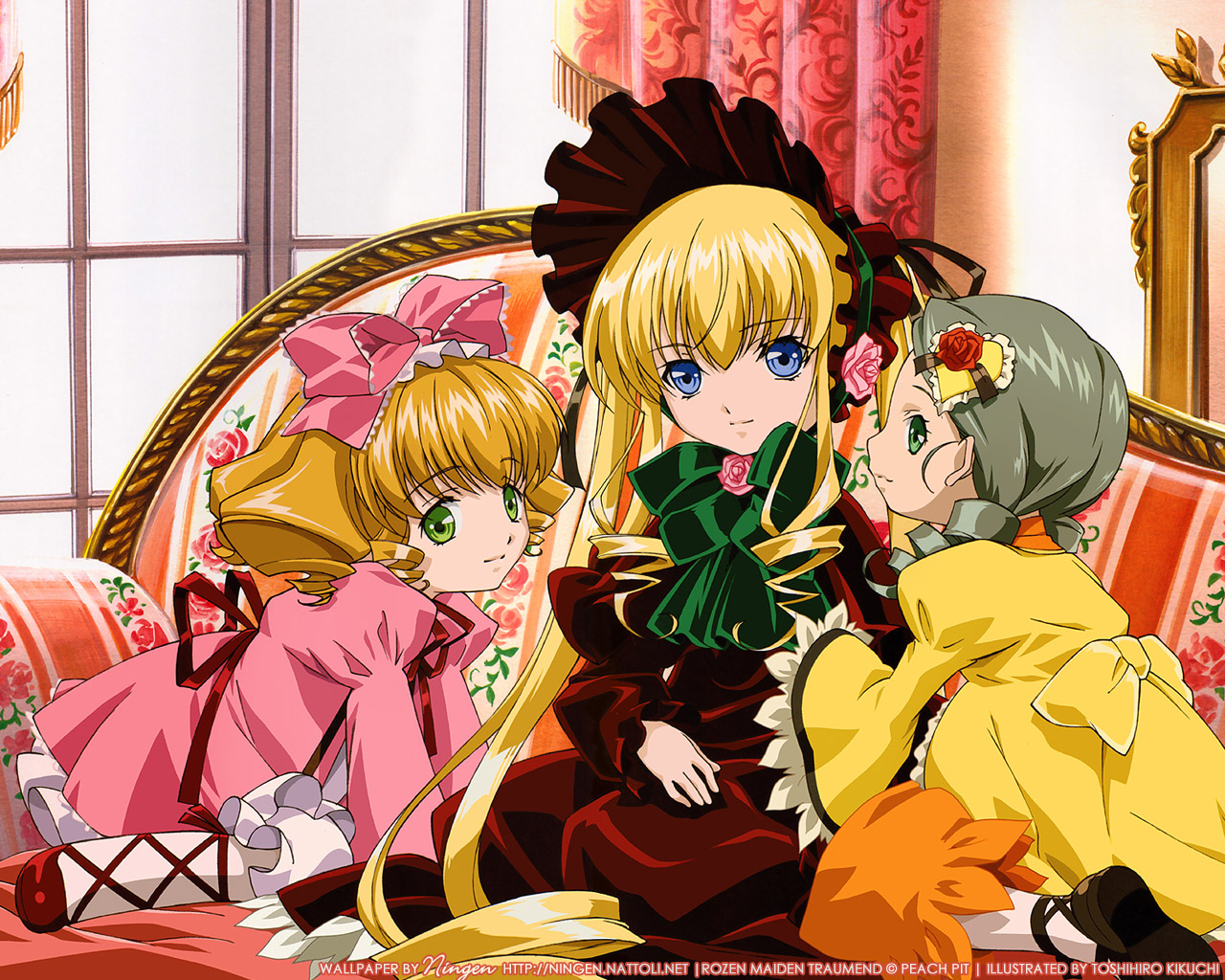Description: A group of women sitting on top of a bed next to each other in a room with pink curtains.
