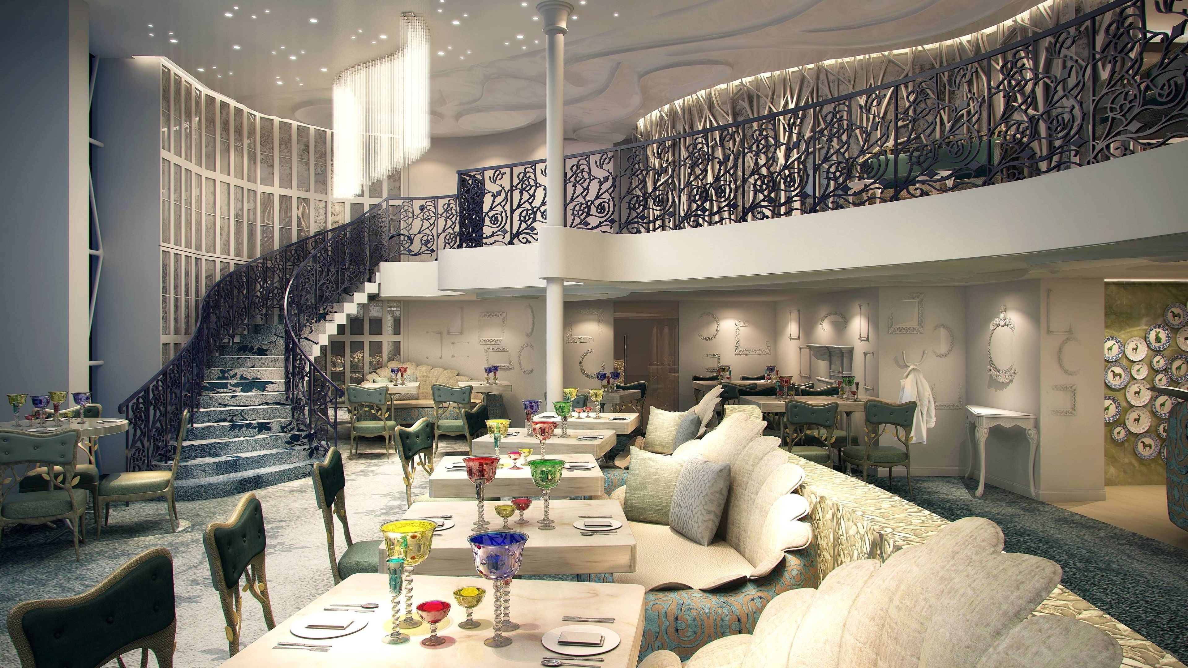 Description: A large room with a spiral staircase and a spiral staircase in the center of it.