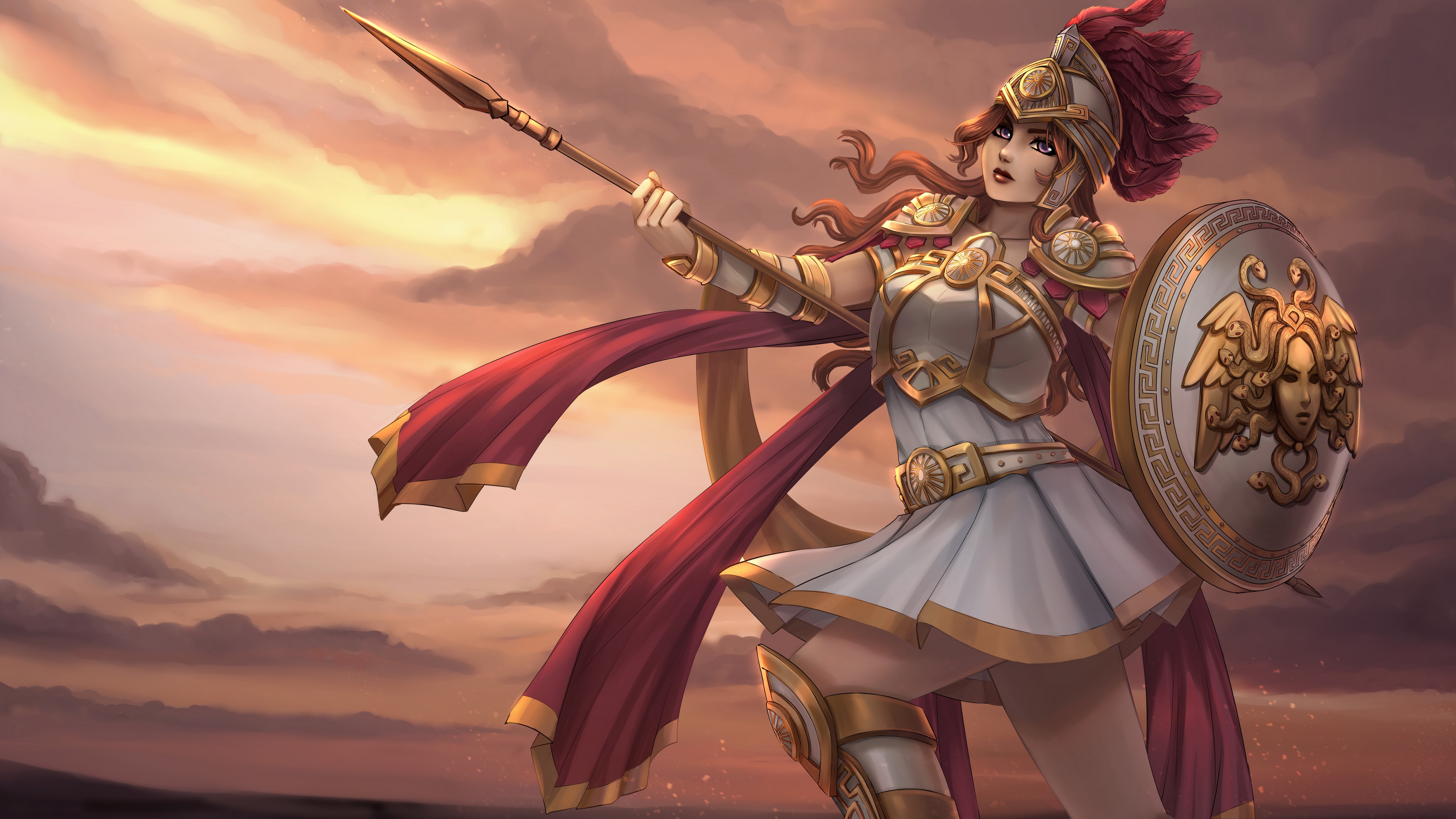 Description: A woman dressed in a roman armor holding a sword and shield in her hand and a cloudy sky behind her.