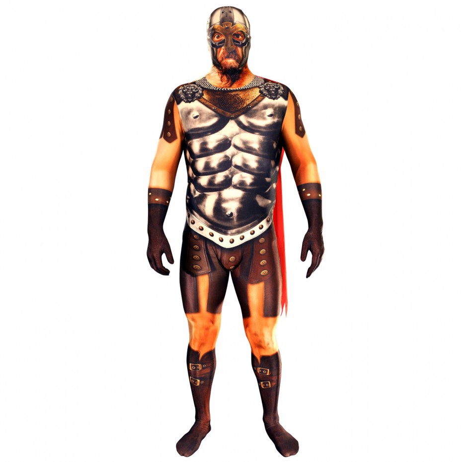 Description: A man in a roman gladia costume standing in a pose with his hands on his hips and his head tilted.