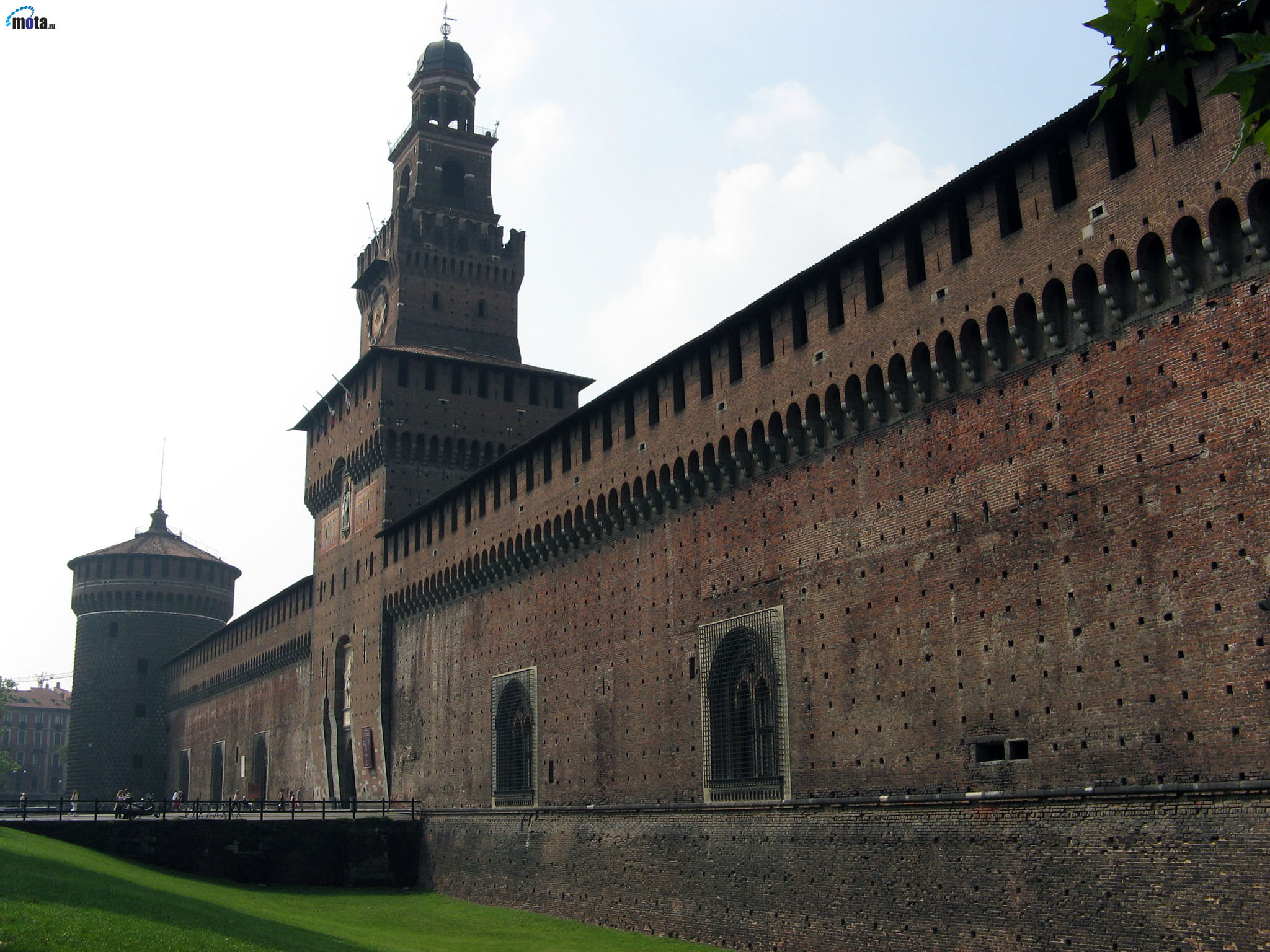 Description: A large brick building with a clock tower in the background and a grassy area in front of it with a fence and a wall.