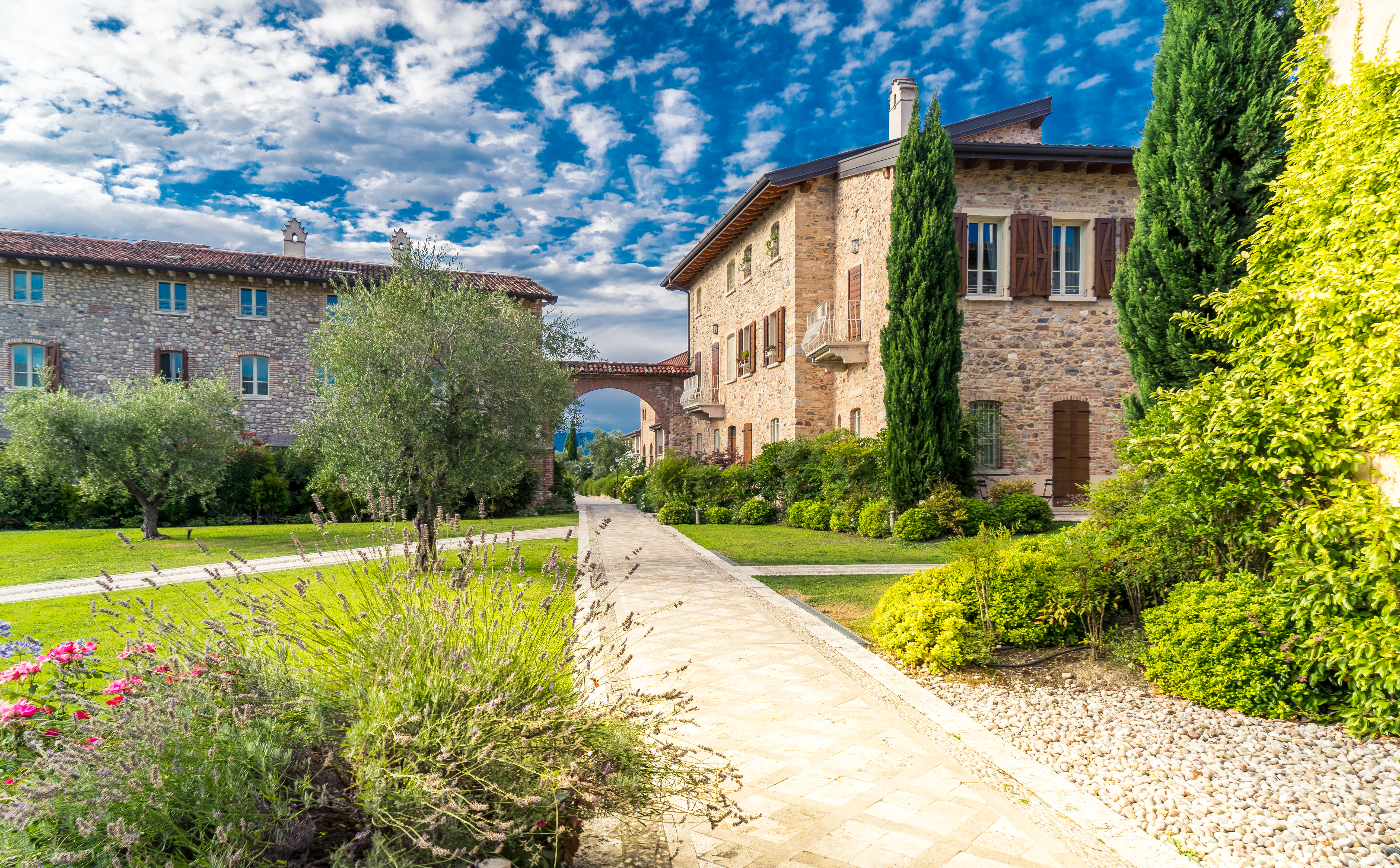 Description: A stone walkway in front of a large building with a clock tower on it's side and a garden in front of it.